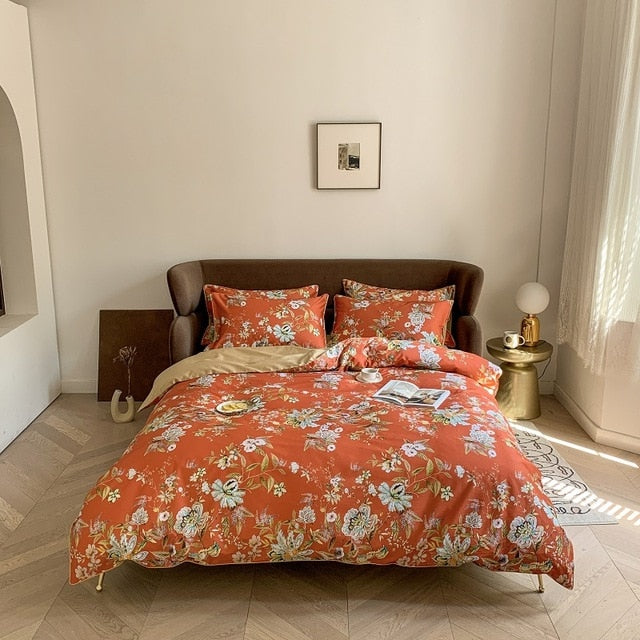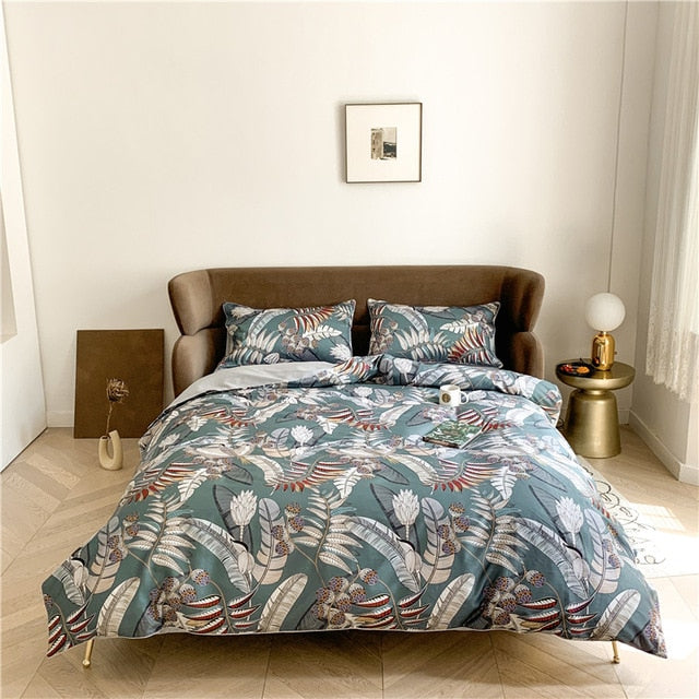 6Pcs Luxury Egyptian Cotton Bedding Set Bright Flamingo Leaf Duvet Cover Bed Fitted sheet