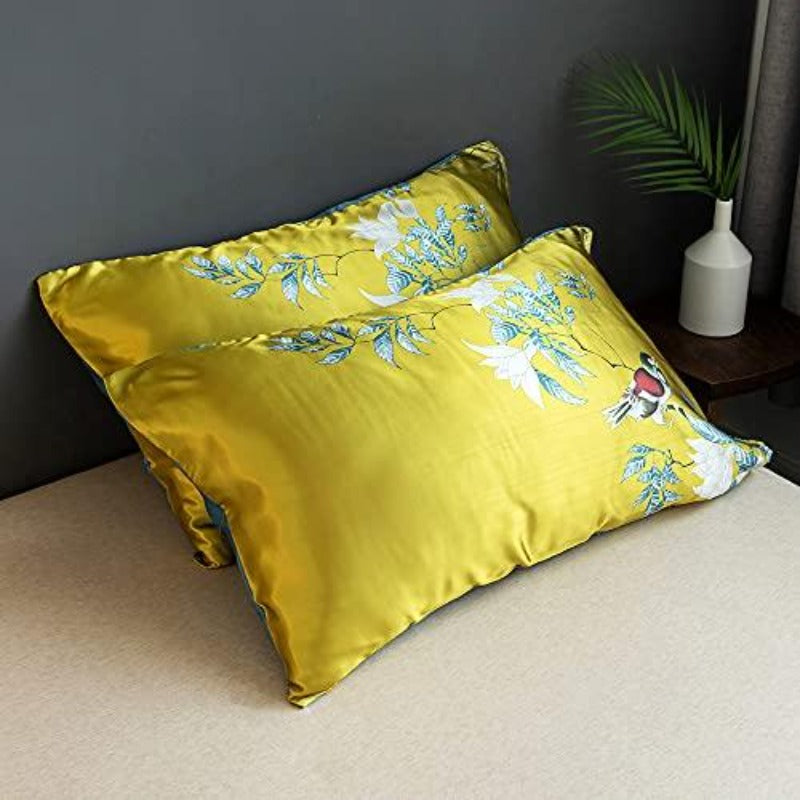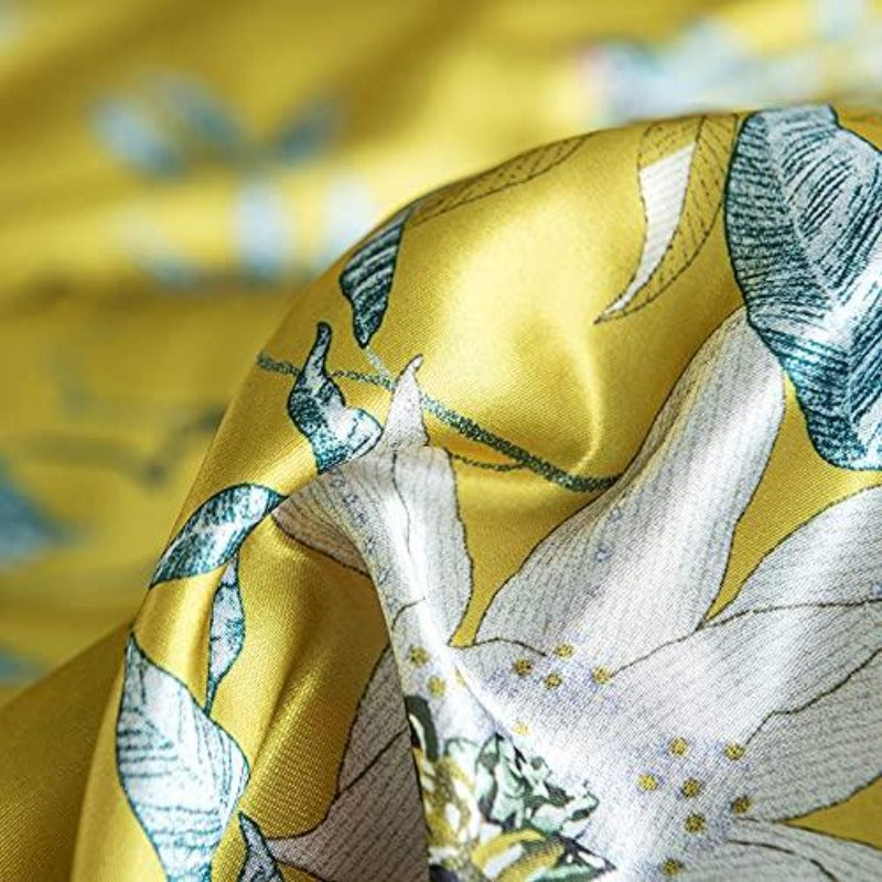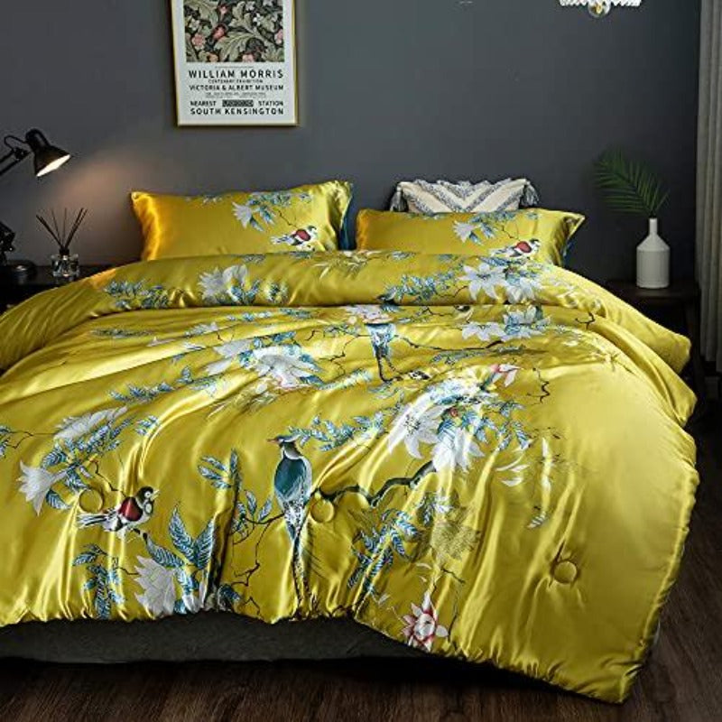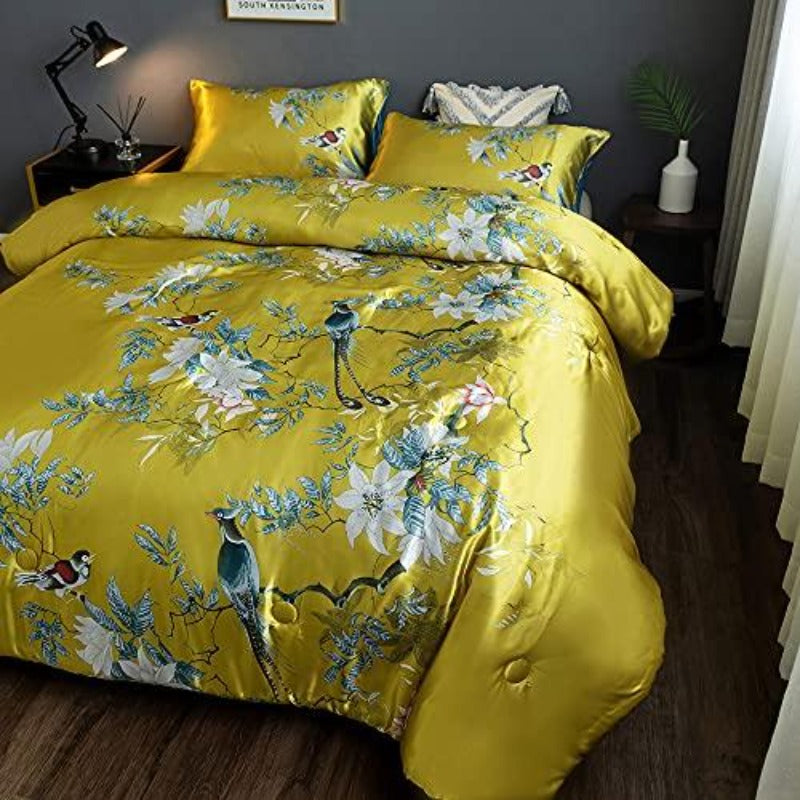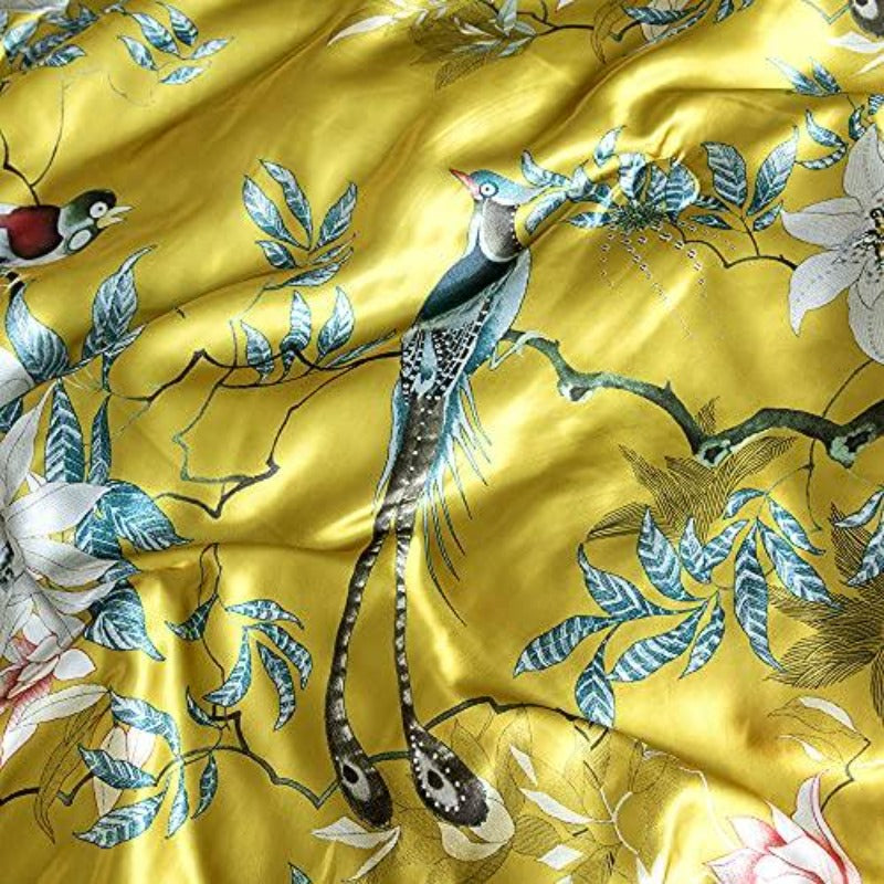Floral Silky Satin Bird Flower Pattern Bedding Set Luxury Comforter Cover Set