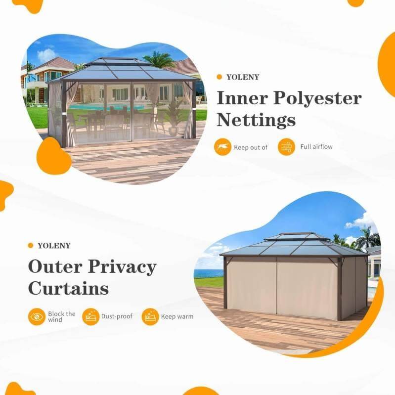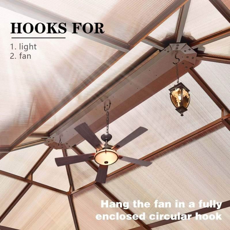 - DOUBLE TOP DESIGN: For fuller protection and fresher air, our patio gazebo features a ventilated, double-layer polycarbonate roof. It prevents harmful UV rays while allowing air circulation and helps withstand wind. *Please note that the polycarbonate roof can only block UV rays, not high temperature and strong light.