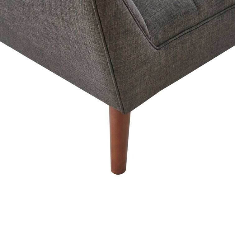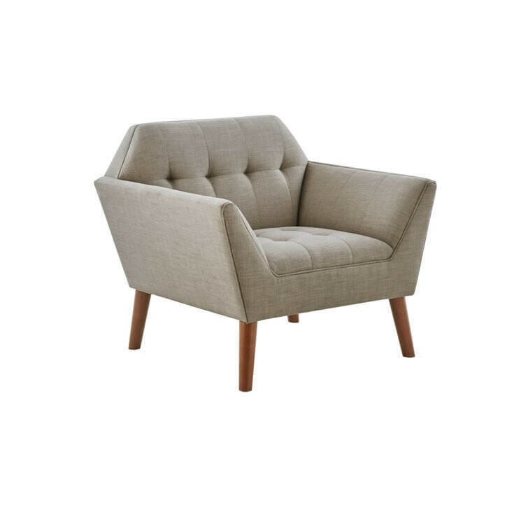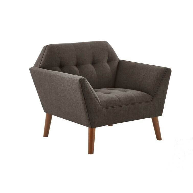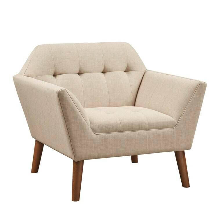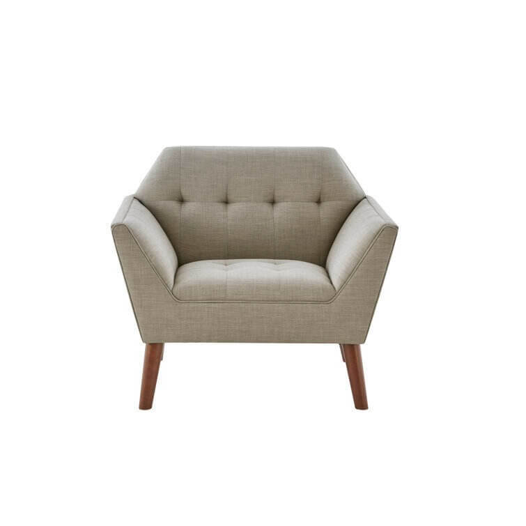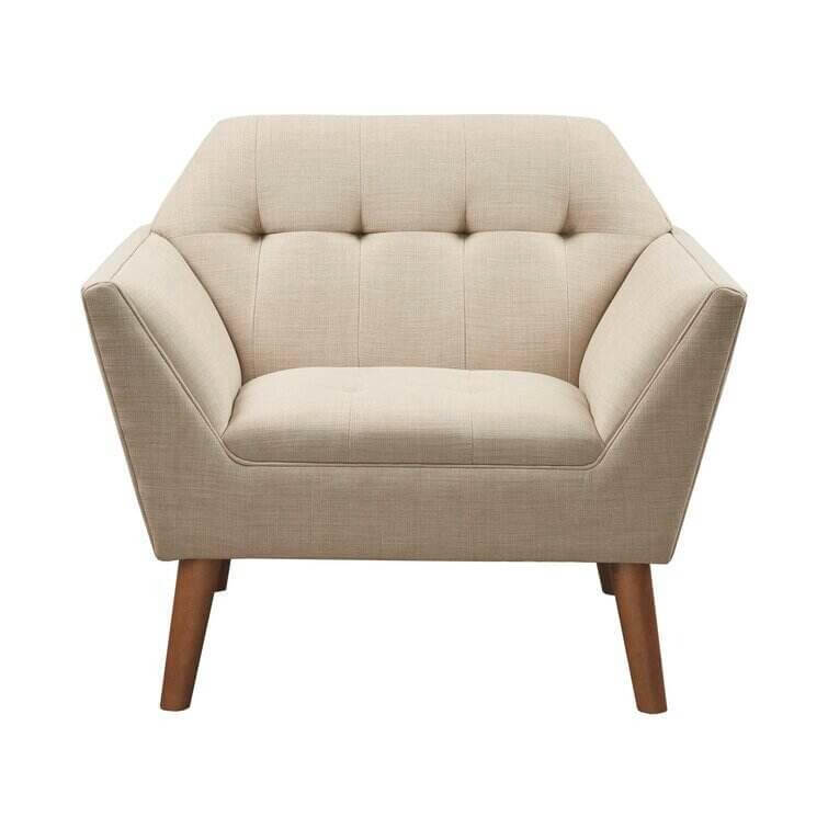 This armchair brings boxy lines to your bedroom or living space. It's made with a solid pecan wood frame and rests on solid wood legs in a warm beige finish. Wrapped in 100% polyester upholstery, its foam-filled, sinuous spring cushions give you just the right amount of support and prevent sagging over time. It strikes an angular, hexagonal silhouette with flared arms and splayed legs for a mid-century modern feel. Button-tufted cushions add a tailored touch, effortlessly elevating your surrounding design scheme.