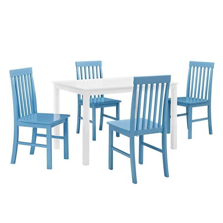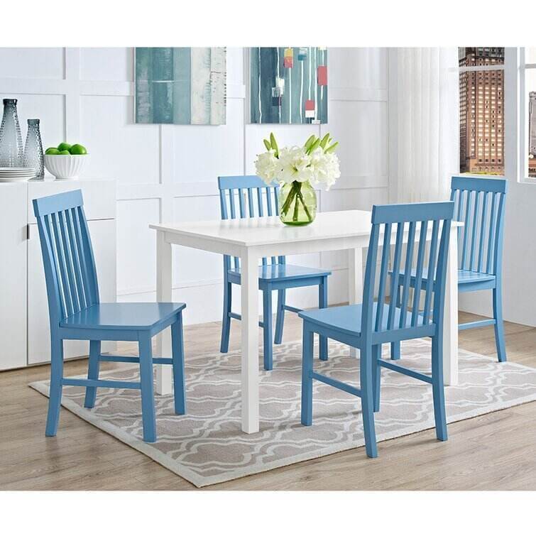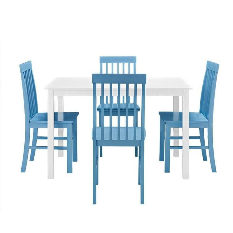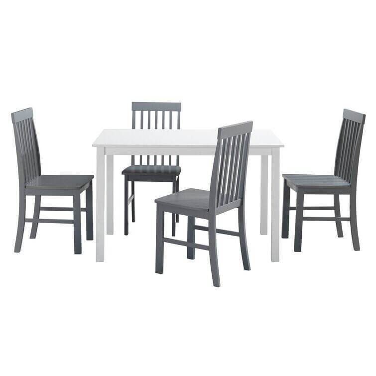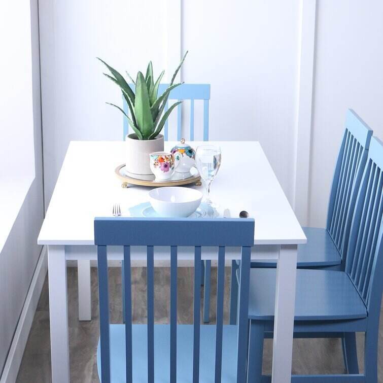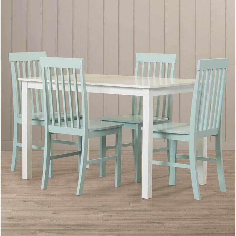 Take your kitchen or dining area to the next level with our modern-style dining set. Including four slatted back chairs with slightly curved angles throughout, in a bright-colored finish. The table features a classic, straight-line design with a painted, fresh white finish for a simple, yet elegant table. Enjoy meals with your family, with this stylish dining set.