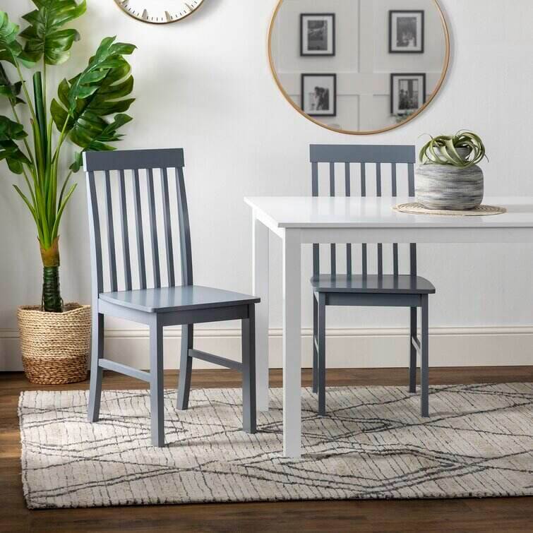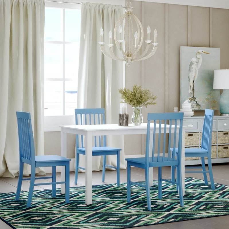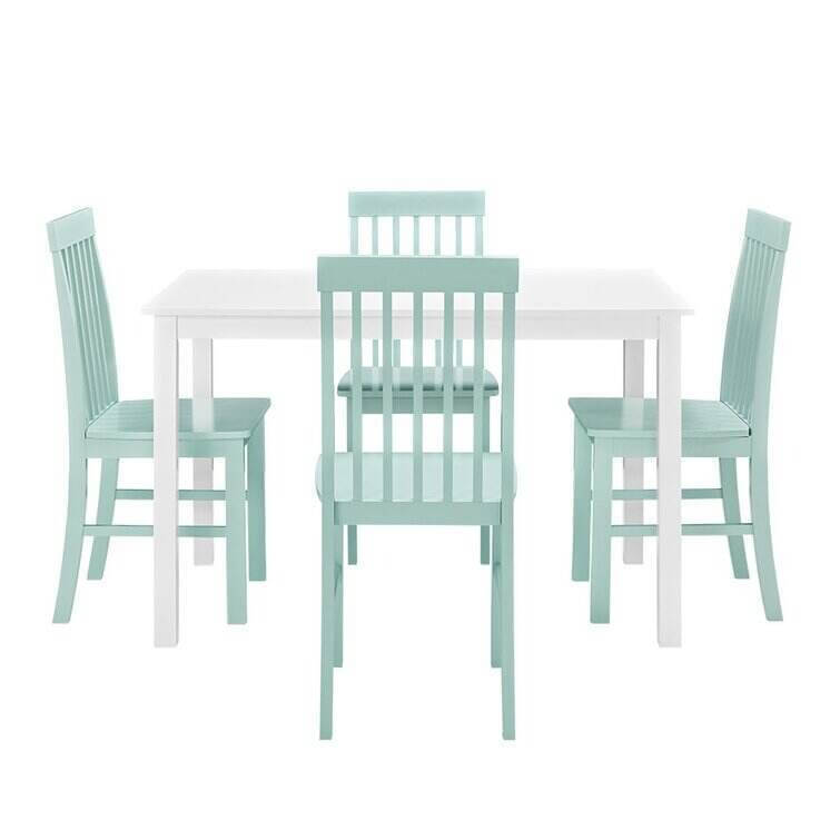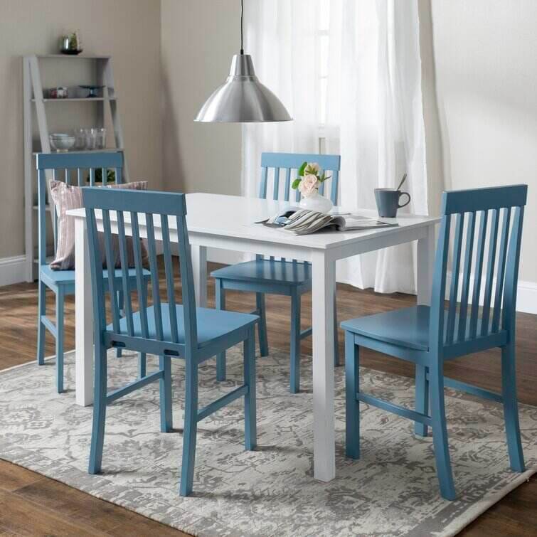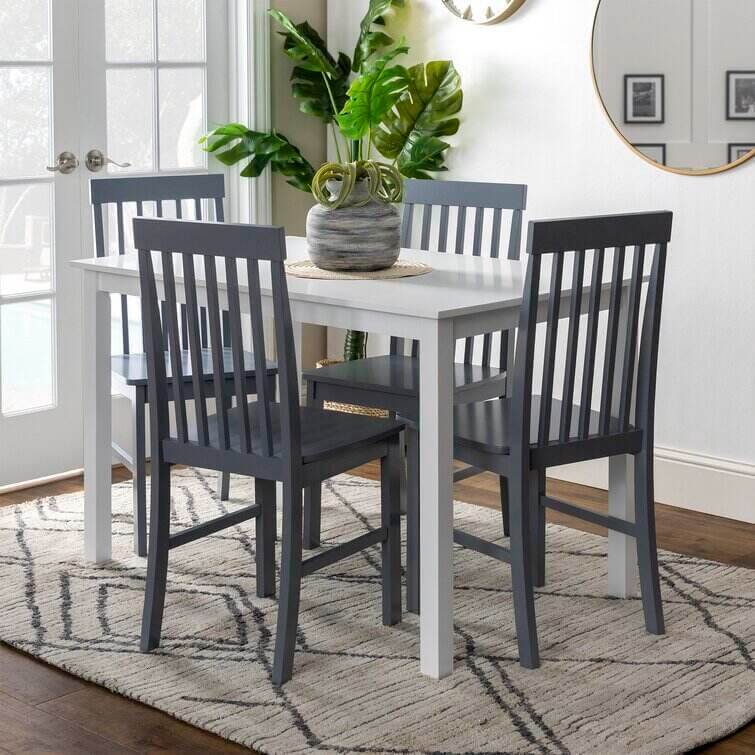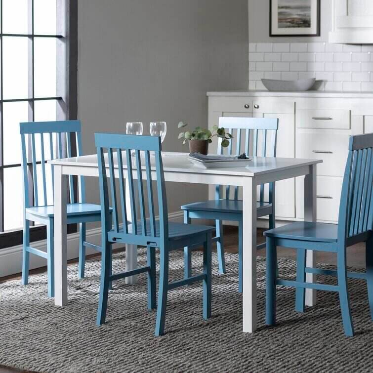 Take your kitchen or dining area to the next level with our modern-style dining set. Including four slatted back chairs with slightly curved angles throughout, in a bright-colored finish. The table features a classic, straight-line design with a painted, fresh white finish for a simple, yet elegant table. Enjoy meals with your family, with this stylish dining set.