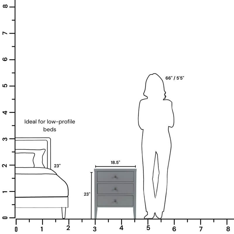 This compact nightstand is great for low-profile beds and small spaces at 22.9" high. The table top is 18.5" by 14.9" for a few of your key bedside essentials.
