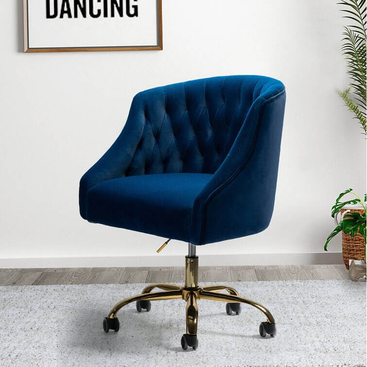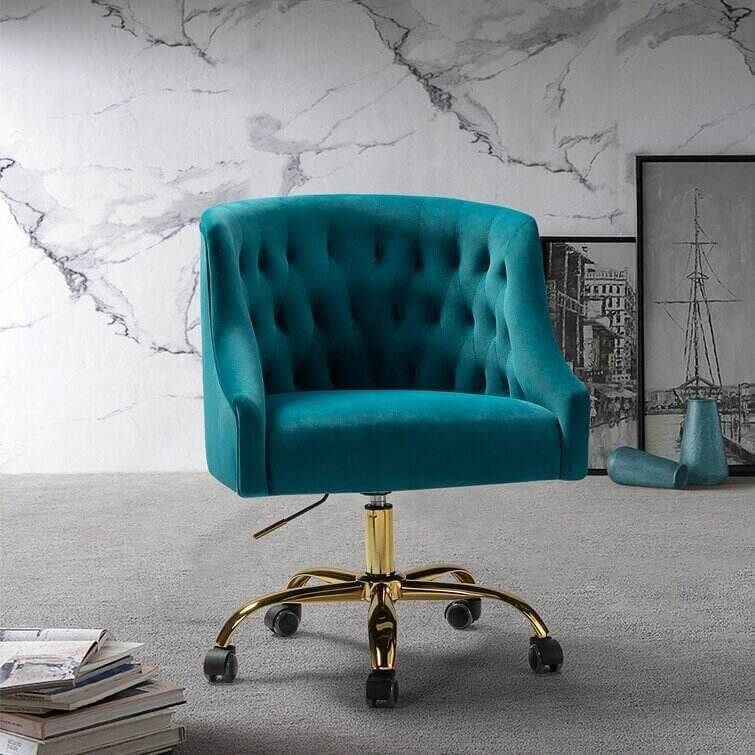 This isn't your standard office chair! It showcases a modified wingback design with a rounded back and sloped, recessed arms for a distinctive look. Button-tufted details dot the back for a bit of texture. This ergonomic office chair is upholstered with velvet in a solid hue for a glam touch to any style — from modern to French country. Down below, it features gold-finished metal legs and five casters that allow smooth movement across your carpet or hardwood floor. It's also seat height adjustable with a swivel function that helps you move from task to task with ease.