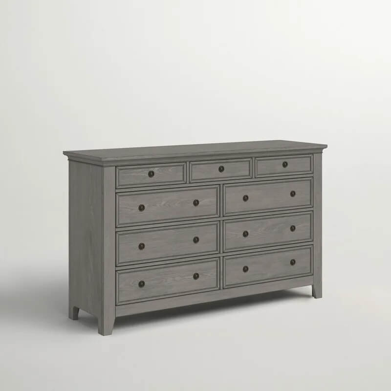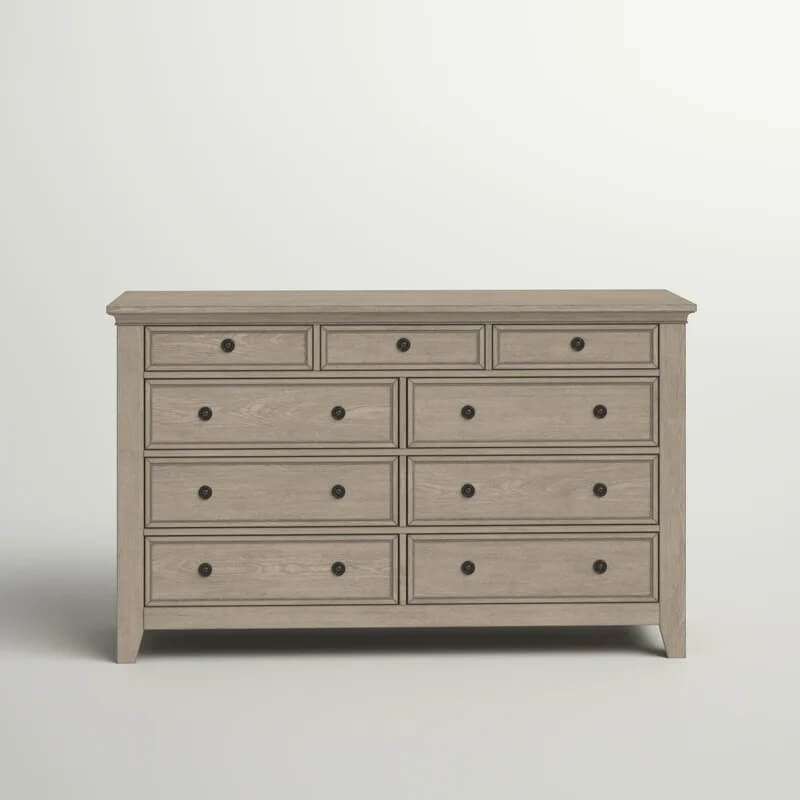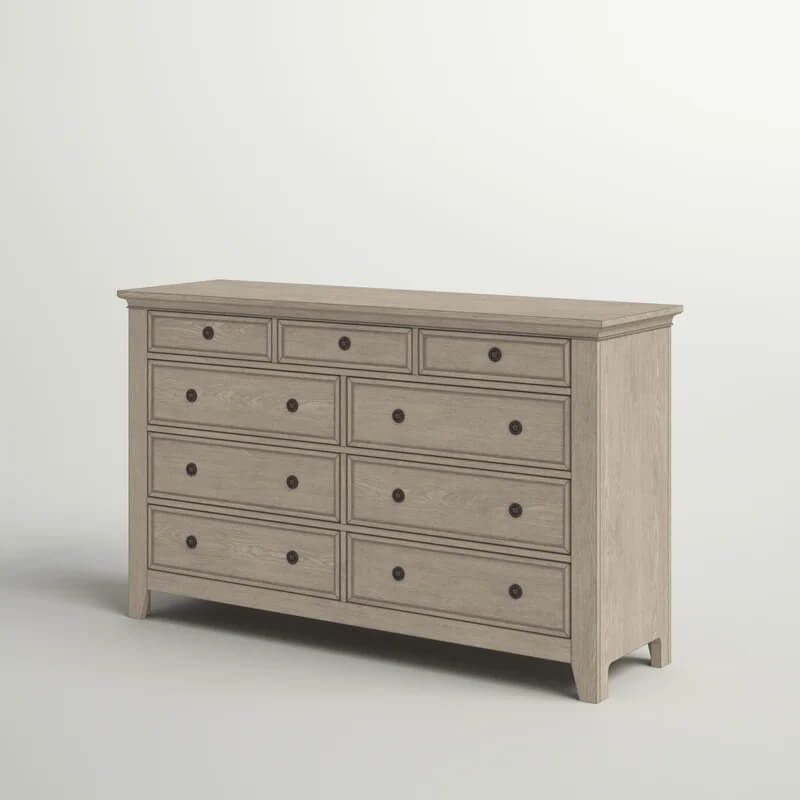 This 9-drawer dresser offers your bedroom spacious hideaway storage and a clean, classic look. It's crafted from solid oak and engineered wood, and each soft-closing dovetailed drawer rolls open on metal ball-bearing glides to provide easy access to your clothing and accessories. Plus, some of the drawers are felt-lined, so they're great for your delicates like jewelry. Picture frame paneling, bronze metal hardware, and tapered feet round out the timeless look. And safety stops to prevent fingers from getting pinched. A wall anchor is included for extra stability.