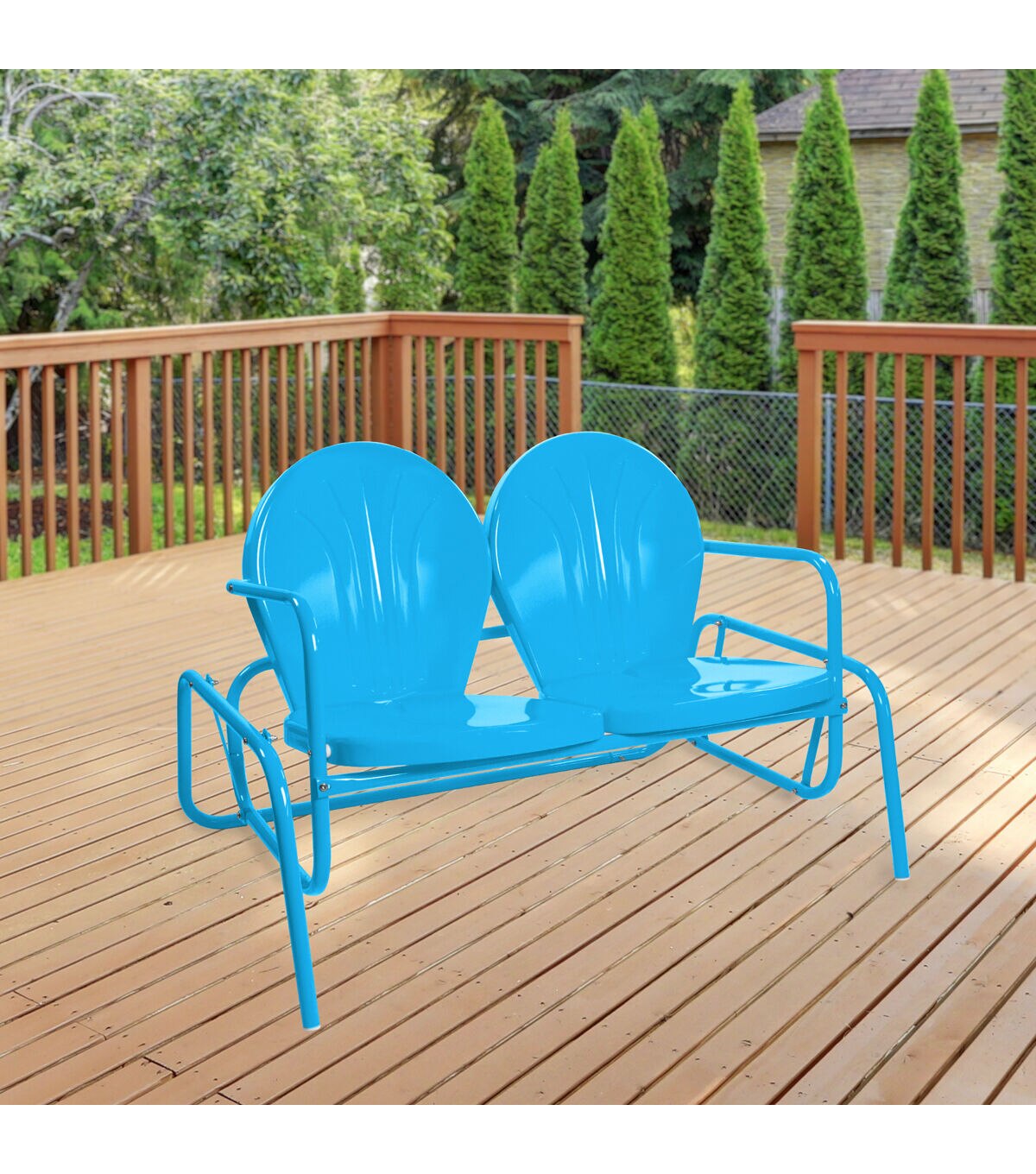 Bring a touch of the '50s to your yard or porch with our vintage-style metal lawn chair. With its weather-resistant powder-coated finish you will have years to enjoy this classic piece. Perfect for enjoying a glass of wine on the patio with family and friends or a good book by yourself. Pairs beautifully with our matching vintage style metal tulip tables. Features: Outdoor retro metal tulip double glider Color: green Long-lasting enamel paint Powder coated finish Plastic caps on legs to protect your surfaces 9-piece easy assembly For indoor or outdoor use Weight capacity: 450lbs Dimensions: Overall: 32"H x 48.25"W x 34"D Seat: 16"H x 39.75"W x 19"D Back: 20"H x 39"W Arm rest: 23.75"H Material(s): steel