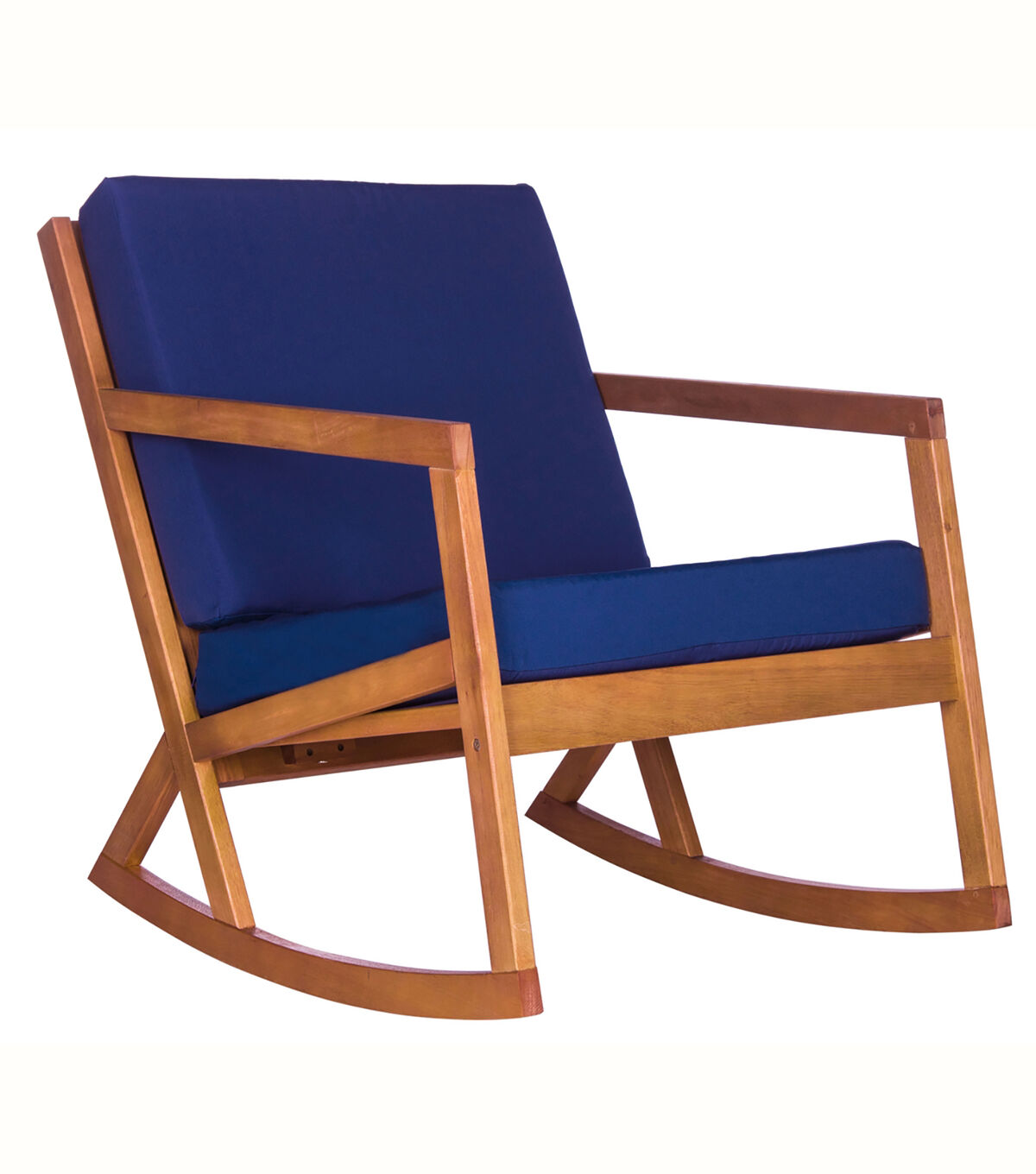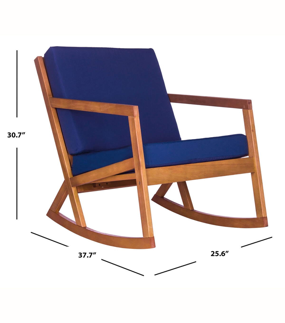 Contemporary with a nod to hand crafted Shaker individuality, this elegant outdoor rocking chair is destined to become a new American classic. Made from eco friendly eucalyptus wood in natural finish, it comes with easy care navy front and back cushions.