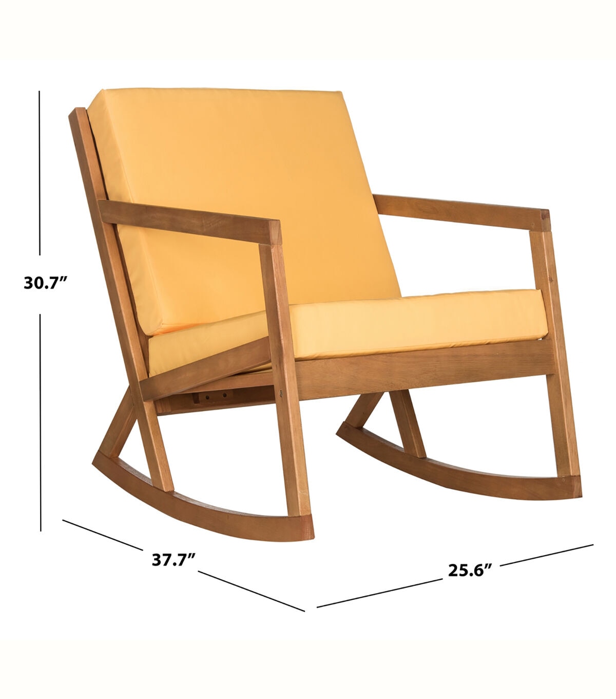 Contemporary with a nod to hand crafted Shaker individuality, this elegant outdoor rocking chair is destined to become a new American classic. Made from eco friendly Eucalyptus wood in natural finish, it comes with easy care yellow front and back cushions.