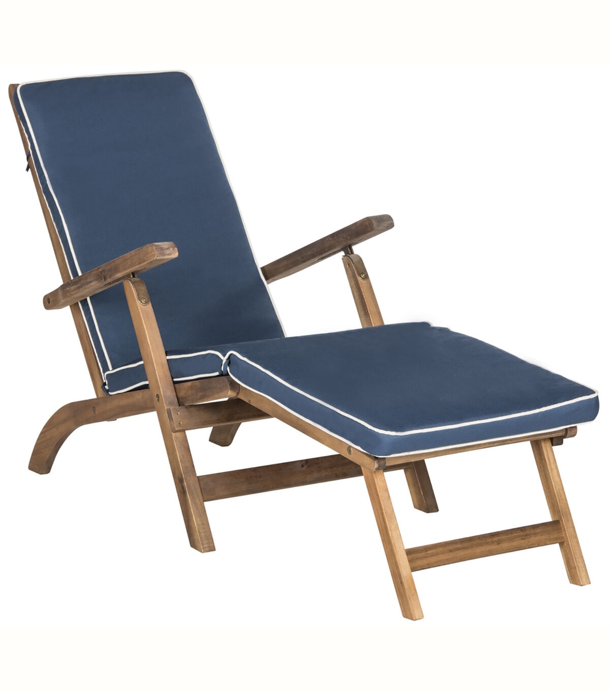 Inspired by ocean liner deck chairs, this inviting outdoor lounge exudes classic elegance. Crafted of sustainable acacia wood to withstand outdoor elements, this comfy lounge comes with an all weather cushion in navy blue with nautical white piping.