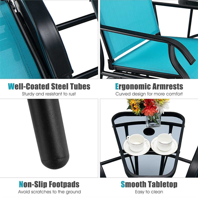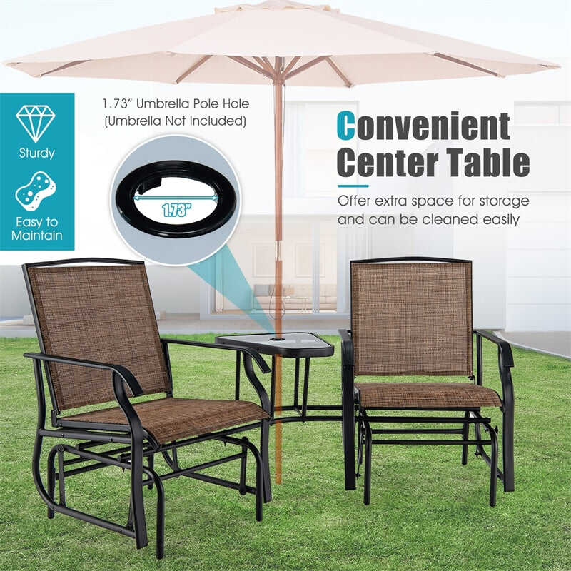 This patio double swing glider chair table set is perfect for a variety of outdoor places like the backyard. poolside. deck. and garden. You could be fully relaxed with this outdoor swing glider chair after long-time work thanks to its ergonomically designed seat and smooth glide motion that would drive away your fatigue and stress. And the 2-seat design allows you to enjoy a good time with best friends or family members. Besides that. the center table with an umbrella hole can supply you with many conveniences. You can put snacks. drinks. magazines and any other small items on it. And the umbrella hole matches most outdoor umbrellas. Meanwhile. its smooth glass tabletop enables daily maintenance quite simple. All in all. this 2-seat swing glider chair will offer you a comfortable relaxing experience outdoors.