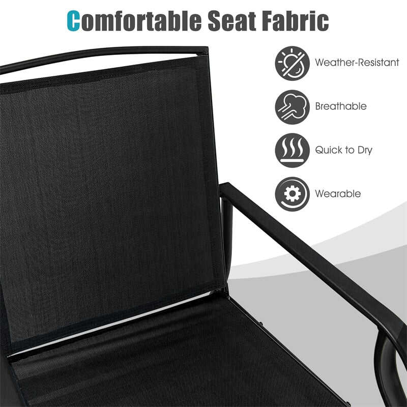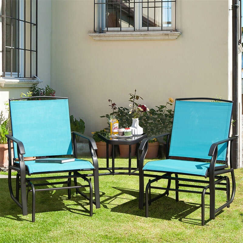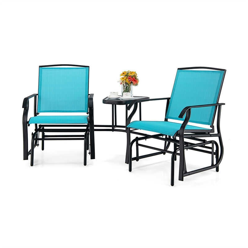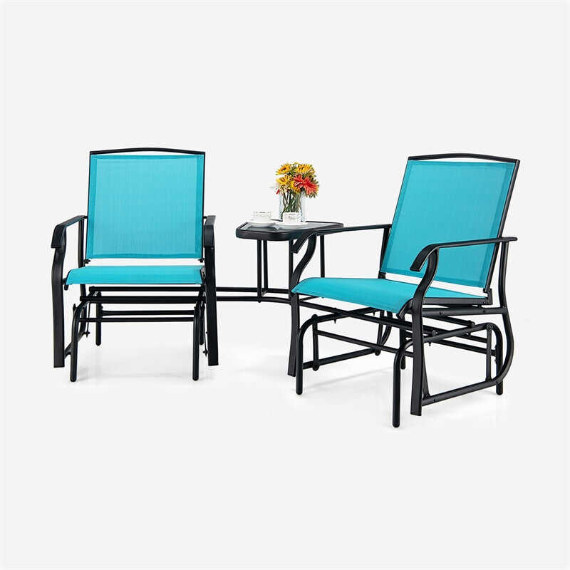 - Smooth 2-Person Outdoor Glider Chairs: This double porch glider chair enables you to enjoy smooth and gentle swinging back and forth. and each chair swings independently. Furthermore. the 2-seat patio glider chair set with a glass table is designed with curved armrests and backrest. bringing you much more comfort and effectively relieving your fatigue.