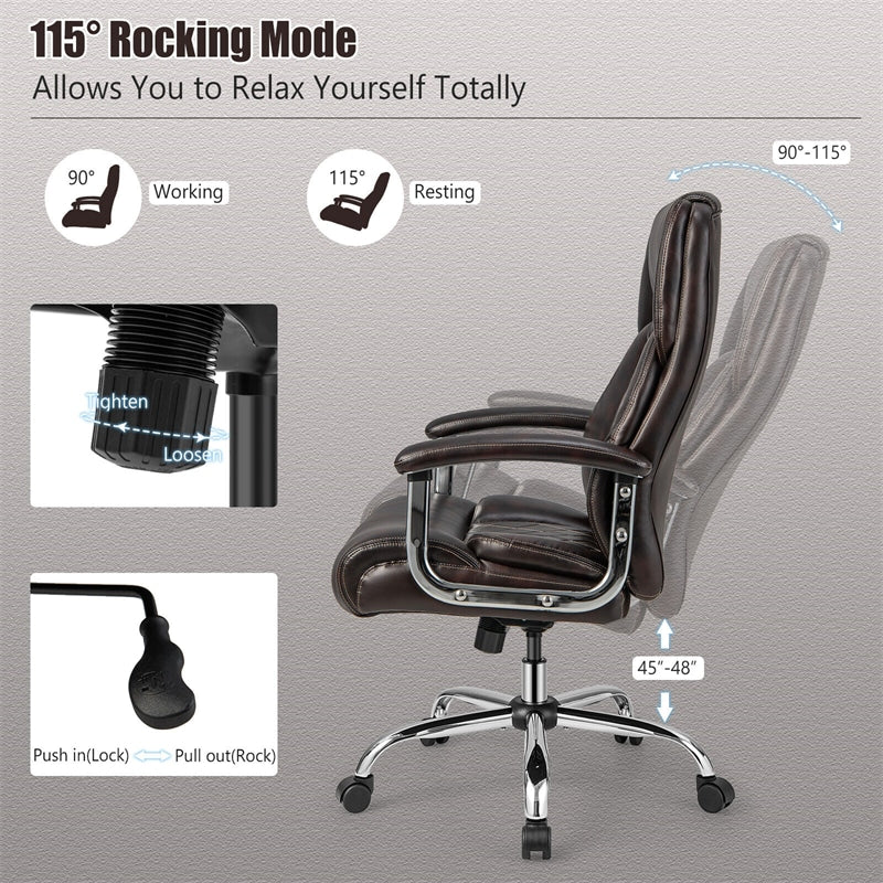 The height-adjustable leather office chair with a heavy-duty base featuring a wide seat and strong bearing capacity of up to 500 lbs is specially designed for big and tall people. Ergonomic high backrest with integrated headrest can extremely relieve back and neck fatigue. The rocking function and 360-degree swivel function offer additional relaxation. Moreover, its seat height can be adjusted to satisfy the needs of people of different heights. Compared to other ordinary seat cushions, this thicker cushion filled with a high-density sponge and elastic spring inside definitely could take the comfortableness to a high level. Thus, the 500 lbs multifunctional swivel leather executive chair combined with a simple modern design is an ideal choice for any place.