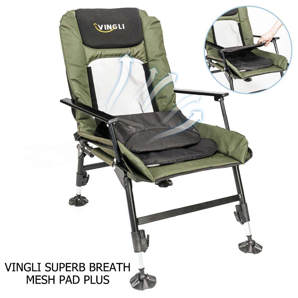 The VINGLI camping chair stands out for its back padding. modern design. slope adjustable legs. and ability to swivel feet on soft ground. It is a versatile chair suitable for base camping and beach trips.