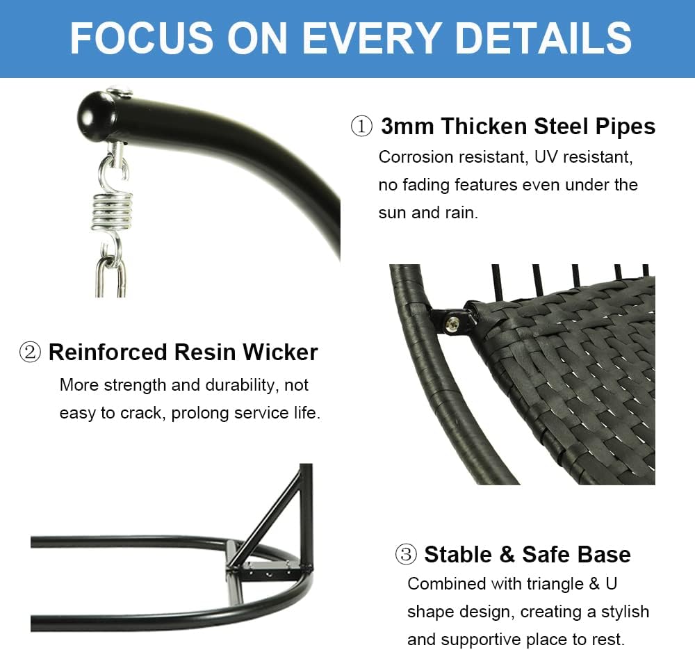 • 【BIG DISCOUNT】Want to own a swing and enjoy the feeling of your childhood? The swing chair constructed from UV protected polyethylene rattan resin wicker wrapped around steel frame, featuring strength and durability, weather resistant, corrosion resistant, odourless and easy to cleanup. Teardrop shape and woven texture will definitely draw attention, helps you get a lot of compliments.