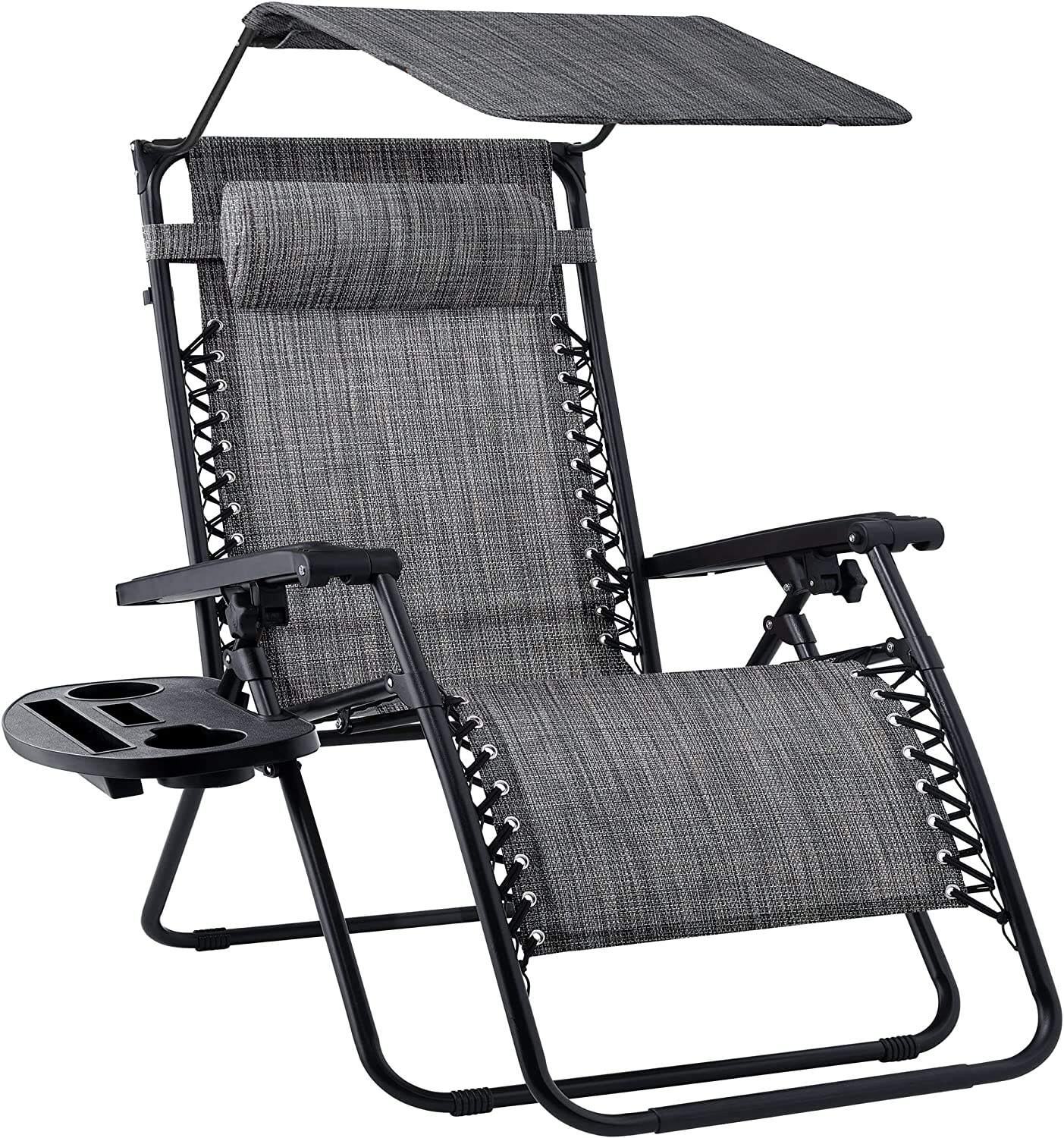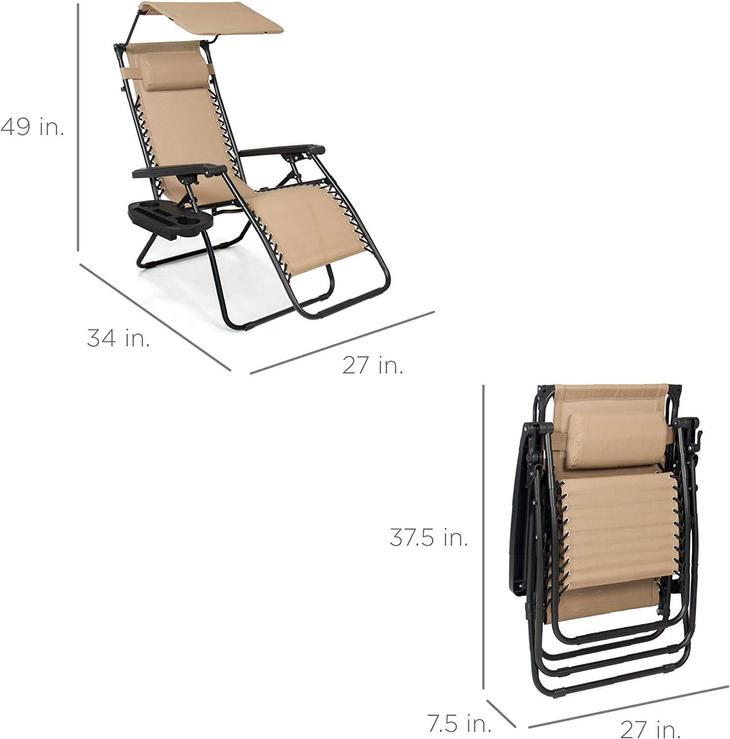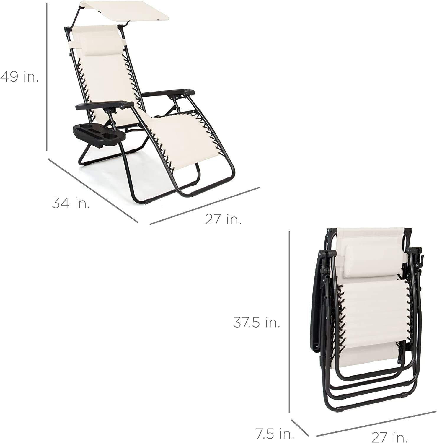 • Folding Zero Gravity Outdoor Recliner Patio Lounge Chair w/Adjustable Canopy Shade, Headrest, Side Accessory Tray, Textilene Mesh - Beige