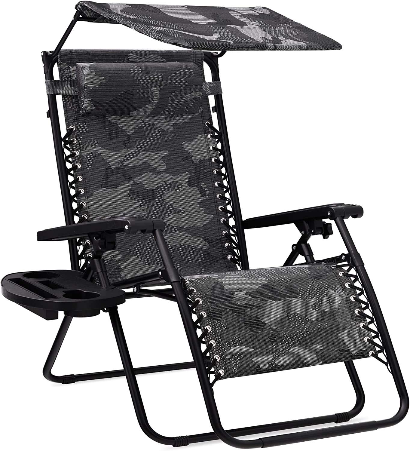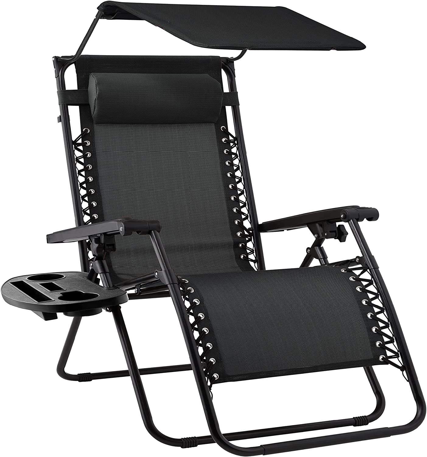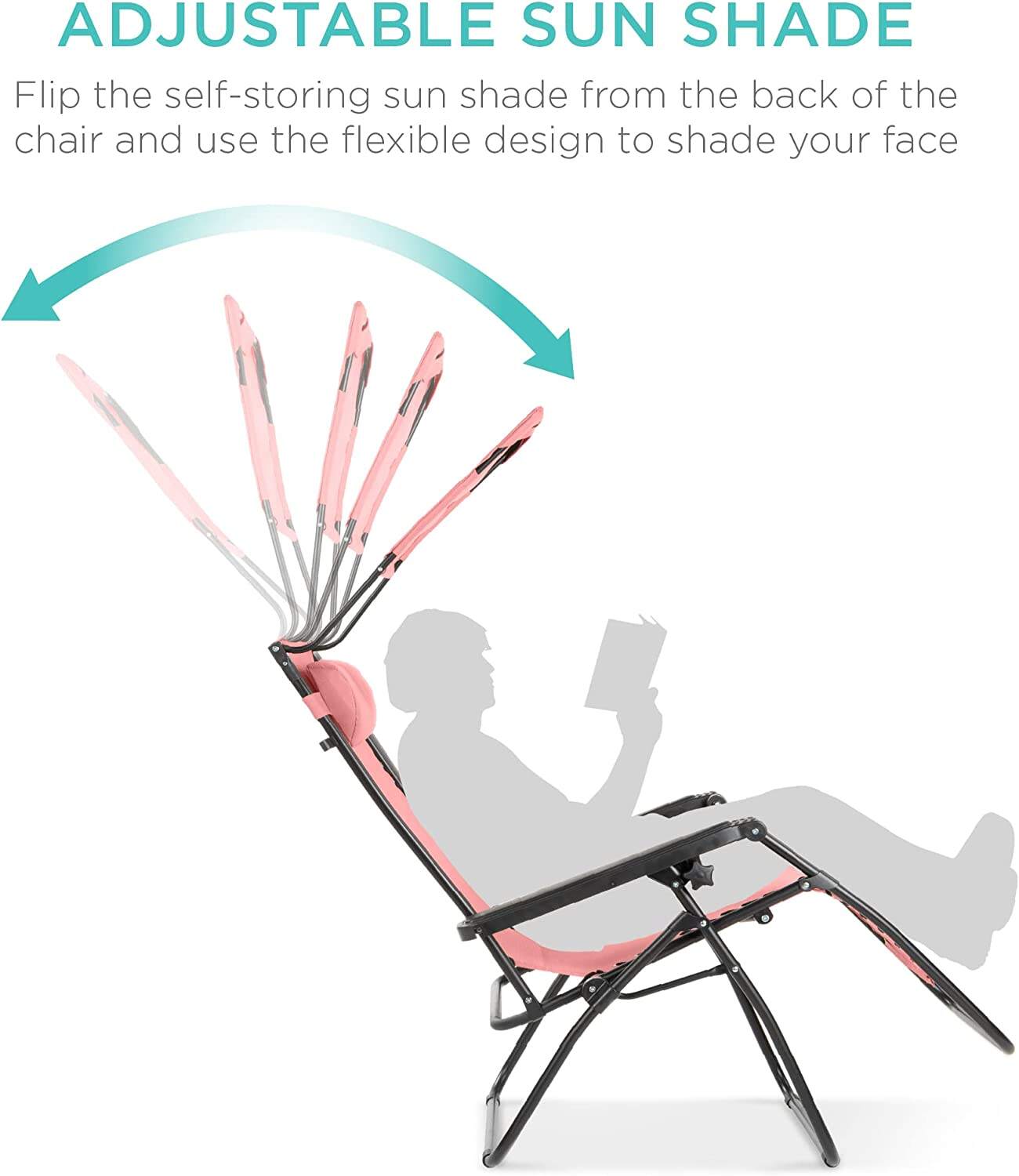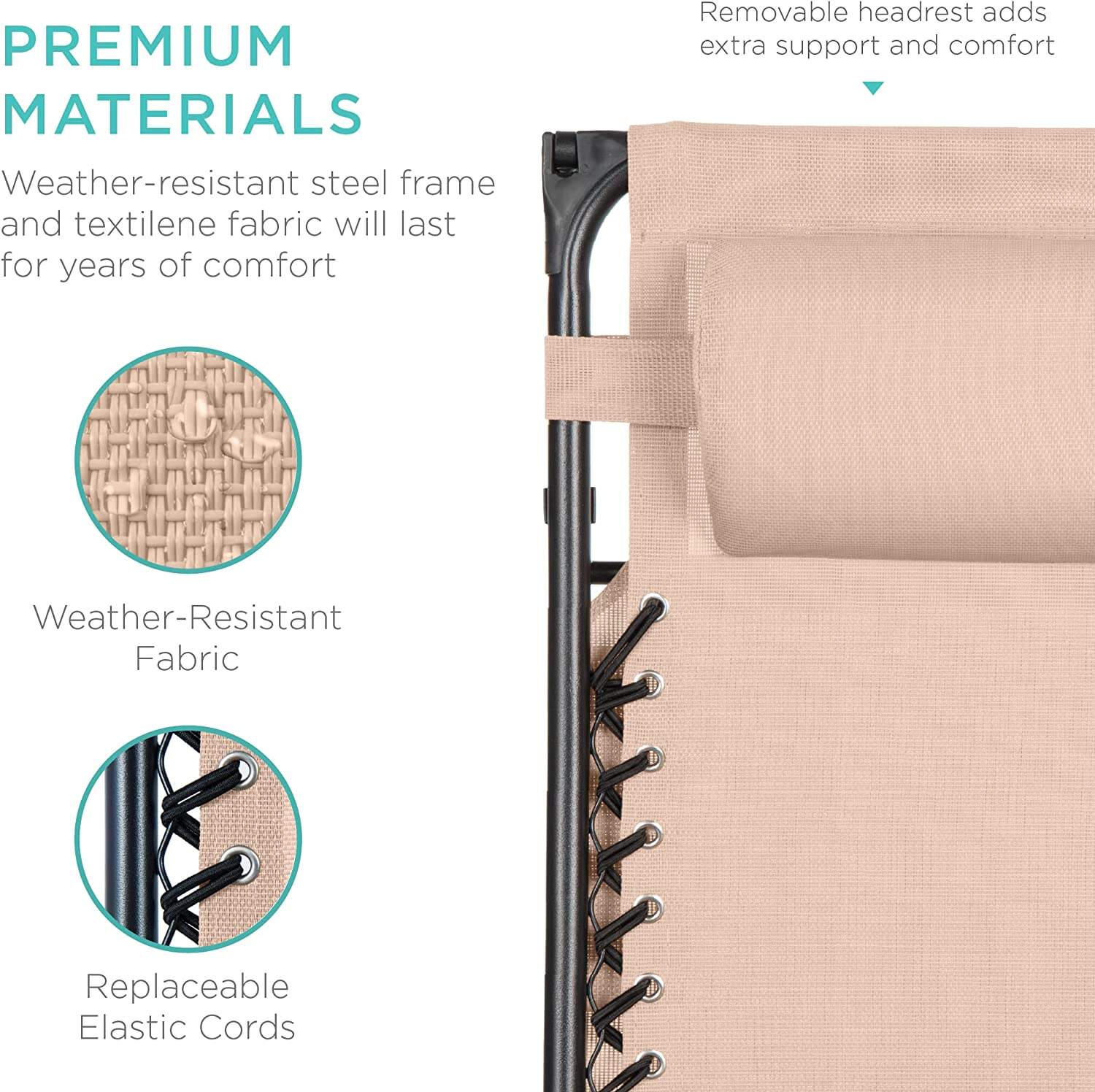 • Folding Zero Gravity Outdoor Recliner Patio Lounge Chair w/Adjustable Canopy Shade, Headrest, Side Accessory Tray, Textilene Mesh - Beige