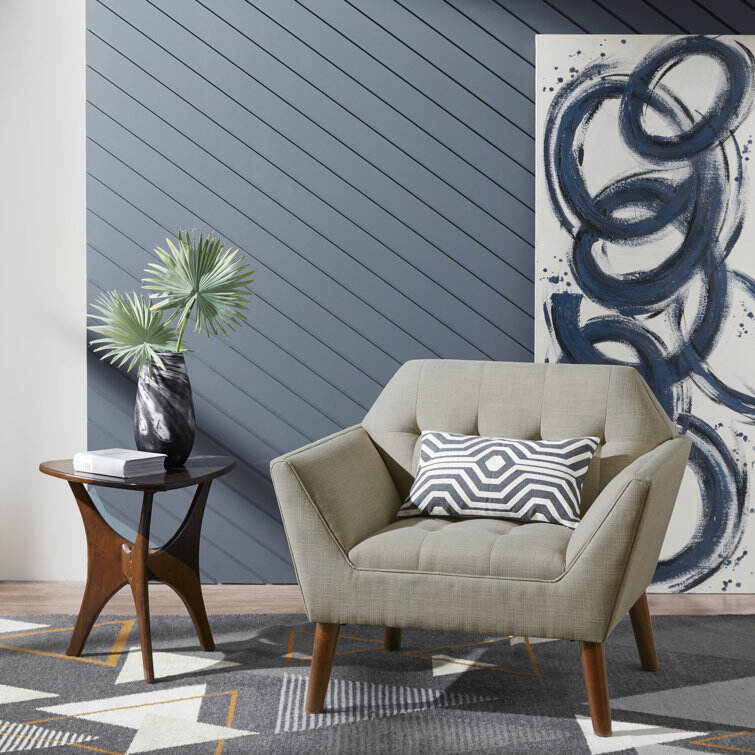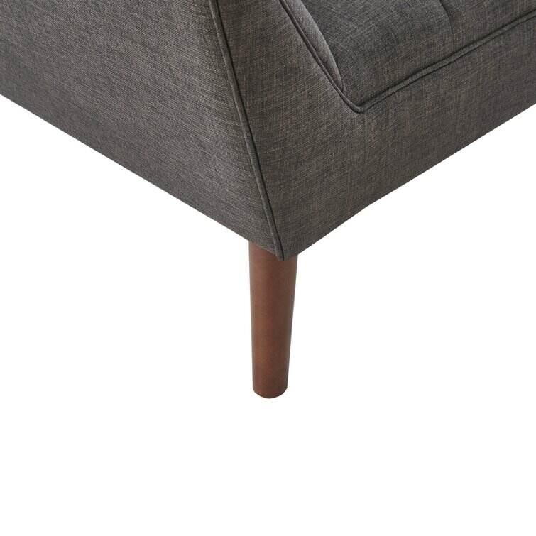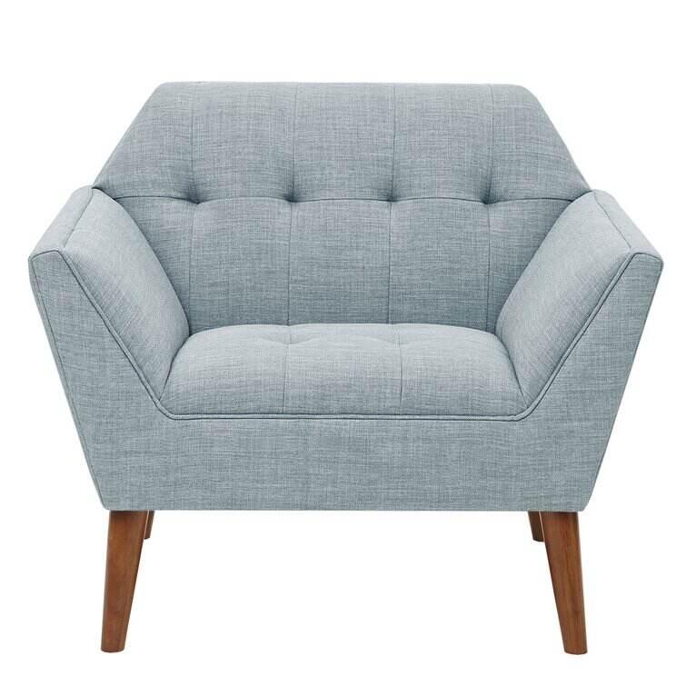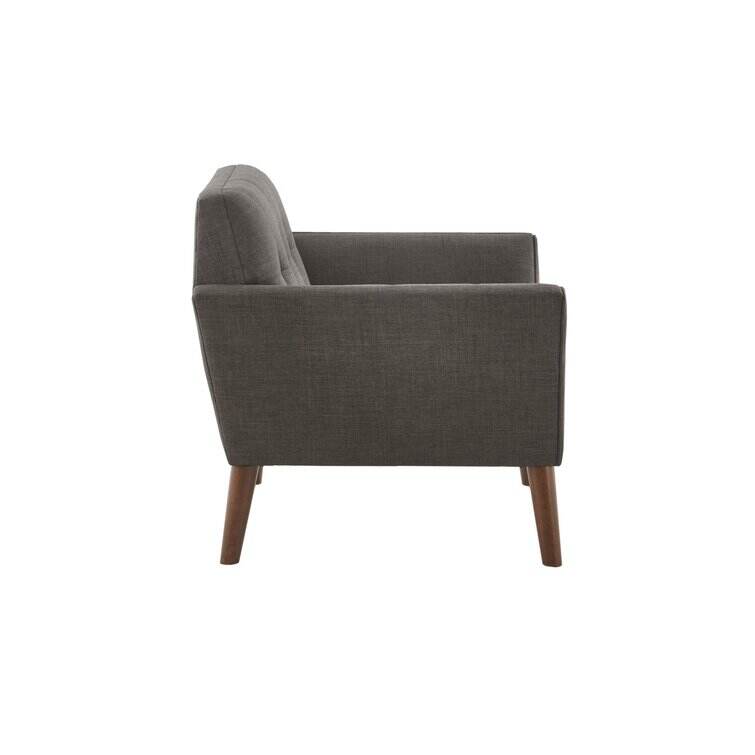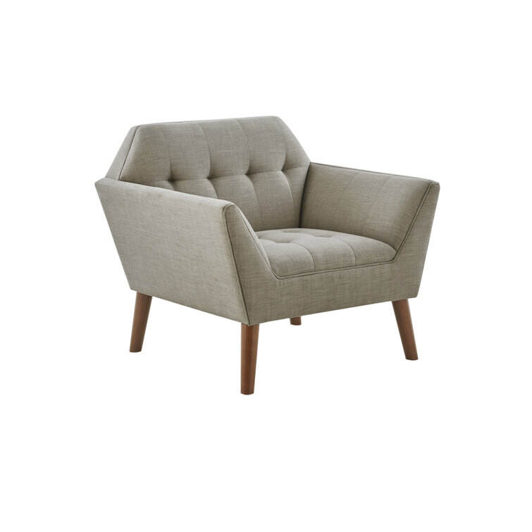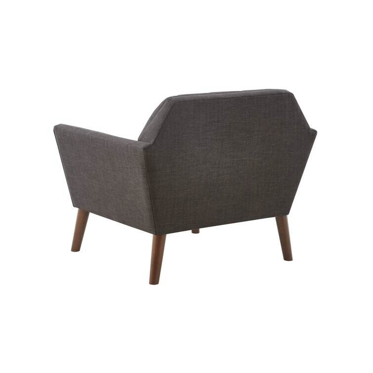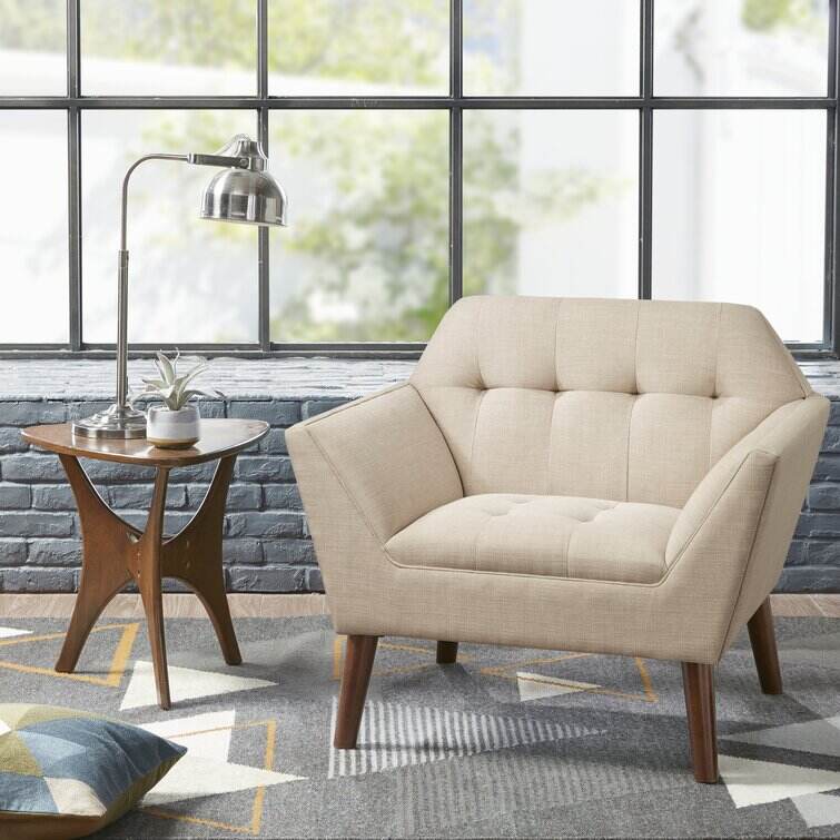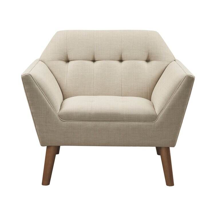 This armchair brings boxy lines to your bedroom or living space. It's made with a solid pecan wood frame and rests on solid wood legs in a warm beige finish. Wrapped in 100% polyester upholstery, its foam-filled, sinuous spring cushions give you just the right amount of support and prevent sagging over time. It strikes an angular, hexagonal silhouette with flared arms and splayed legs for a mid-century modern feel. Button-tufted cushions add a tailored touch, effortlessly elevating your surrounding design scheme.