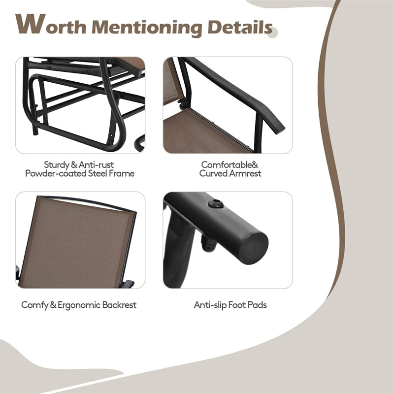 - Comfortable & Safe Design: This 2-person patio rocking loveseat is equipped with a very quiet and smooth gliding system, which brings you the most comfortable gliding experience. Plus, the patio glider chair also comes with protective foot pads that can prevent slipping and protect the ground.