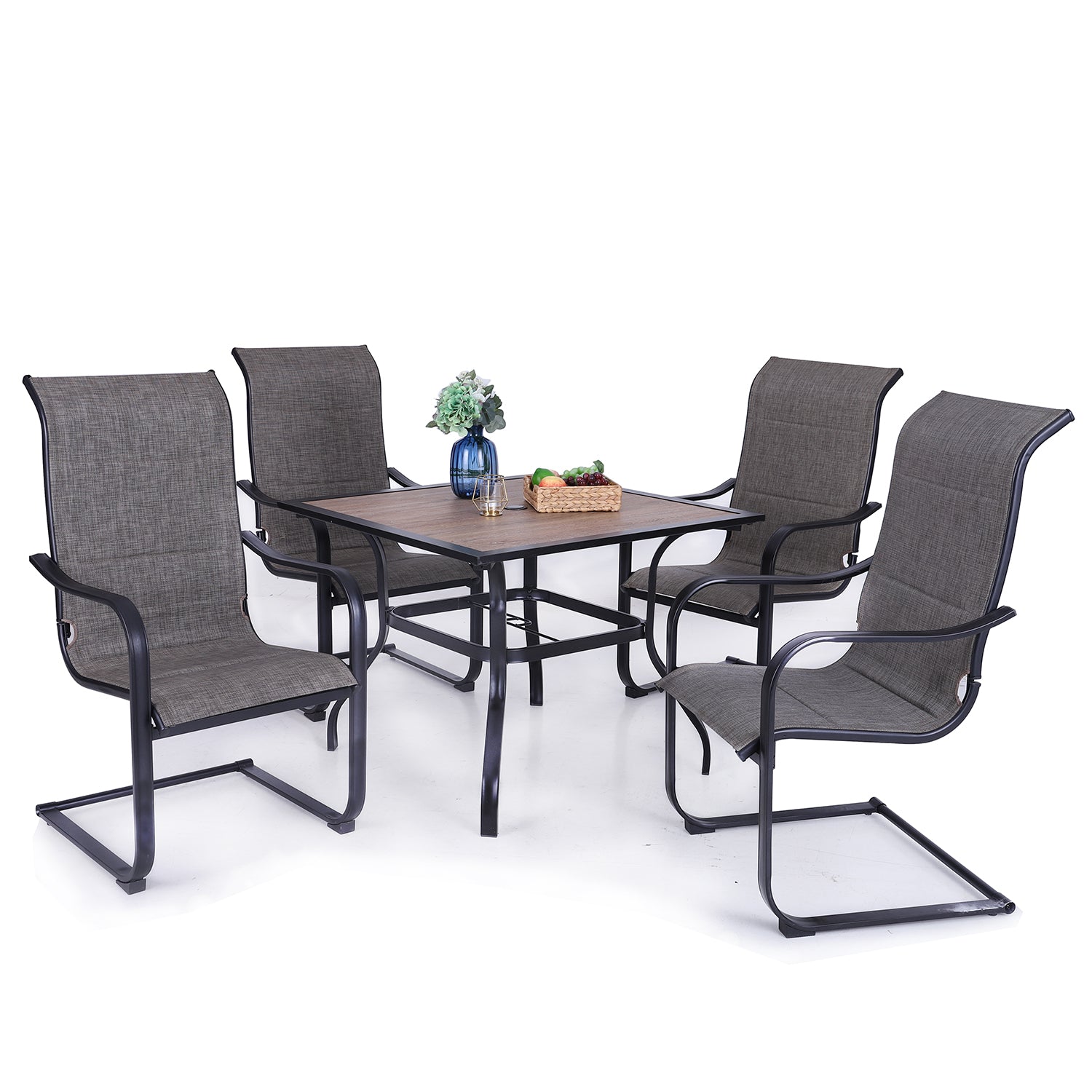 Phi Villa 5-Piece Outdoor Dining Set Wood-look Square Table & 4 Textilene C-spring Chairs