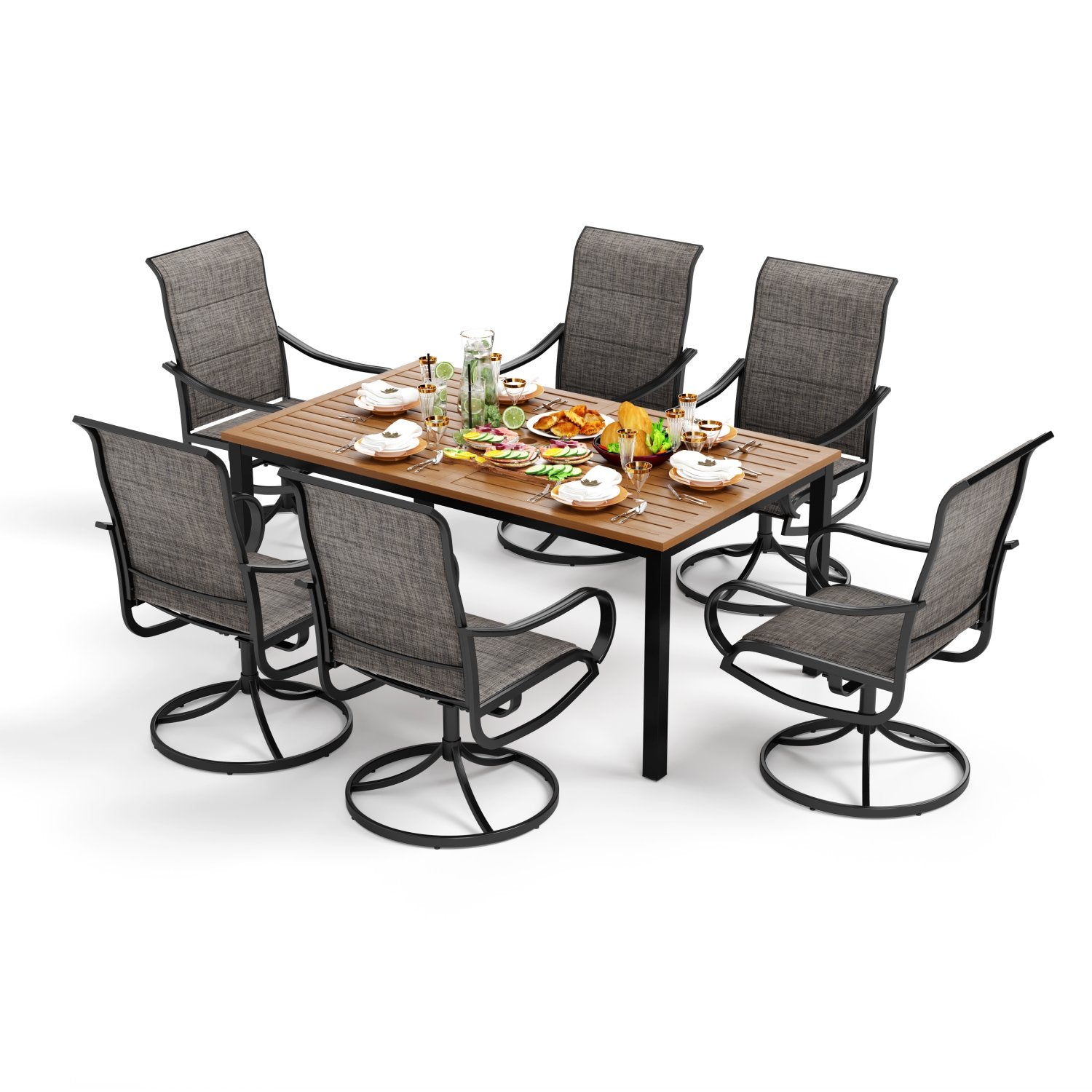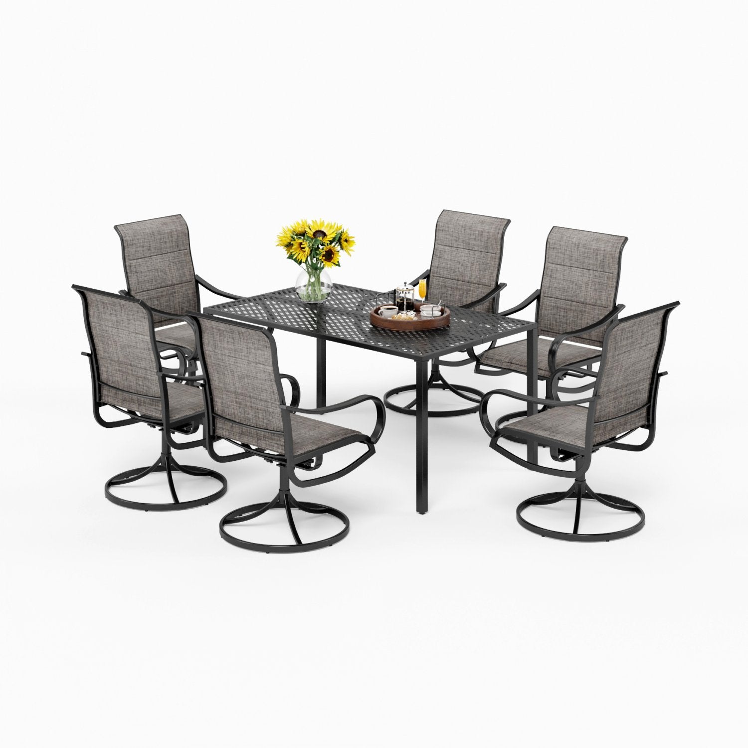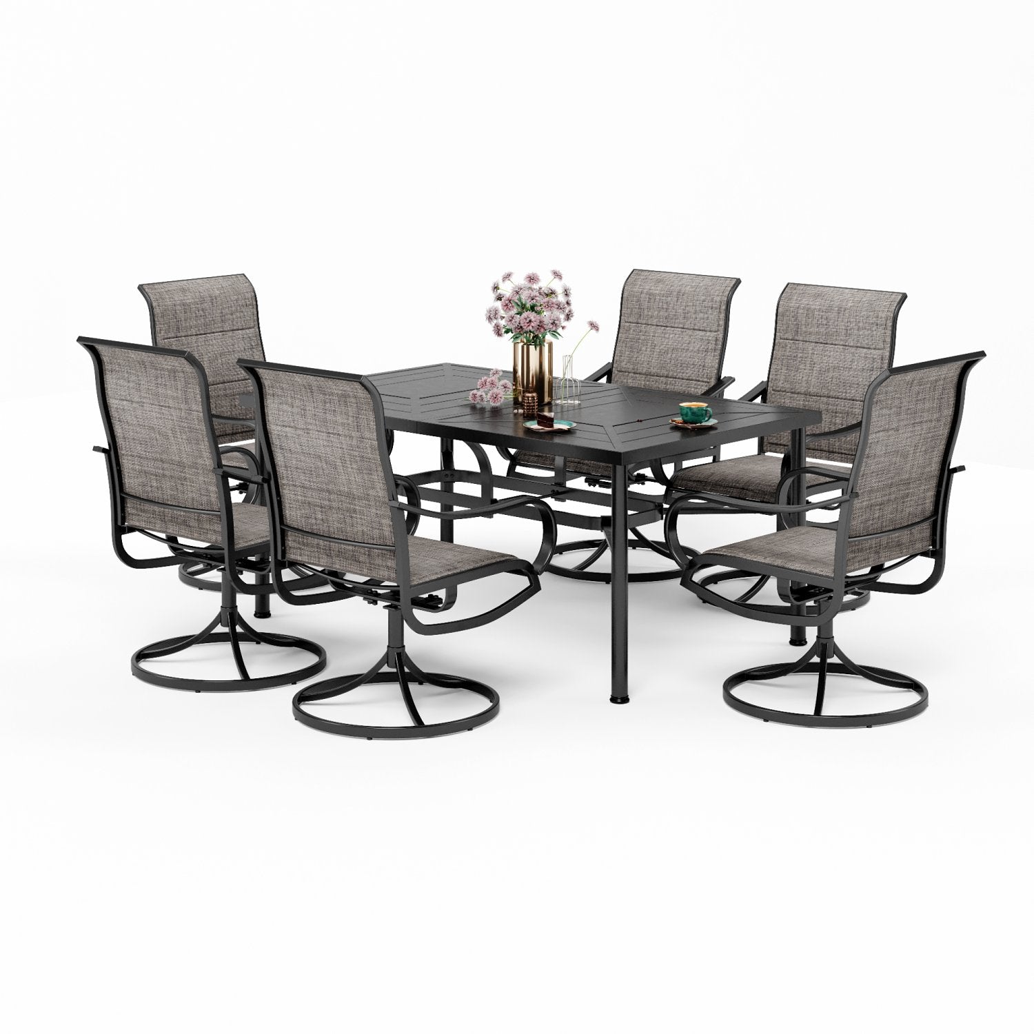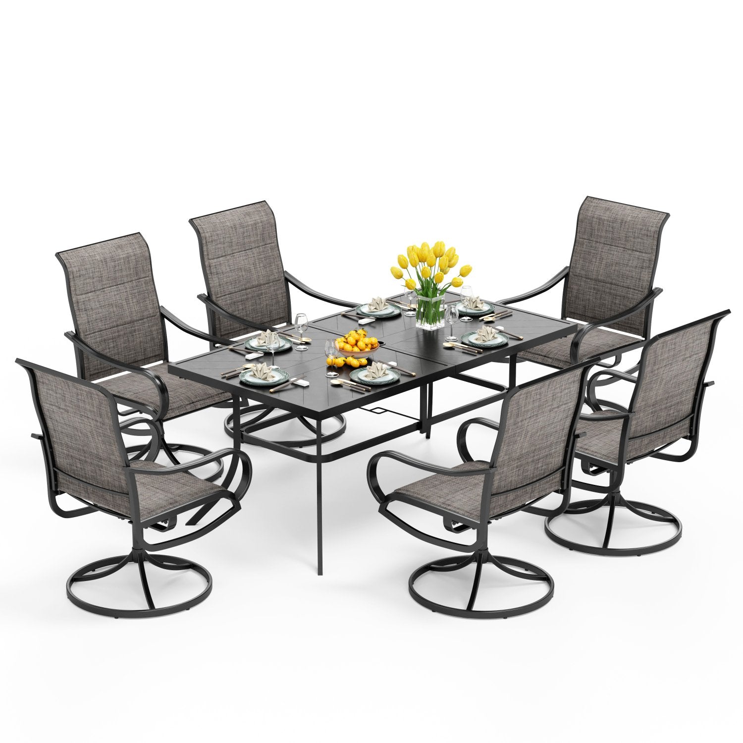 7-Piece Patio Dining Set 6 Textilene Padded Swivel Chairs and Steel Rectangle Table
