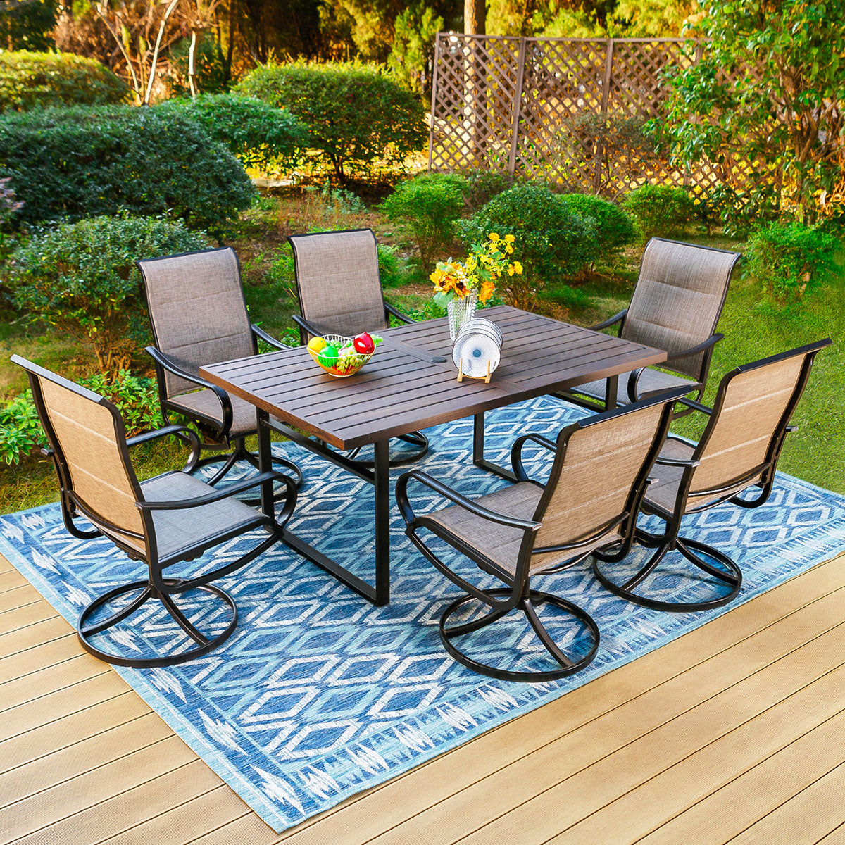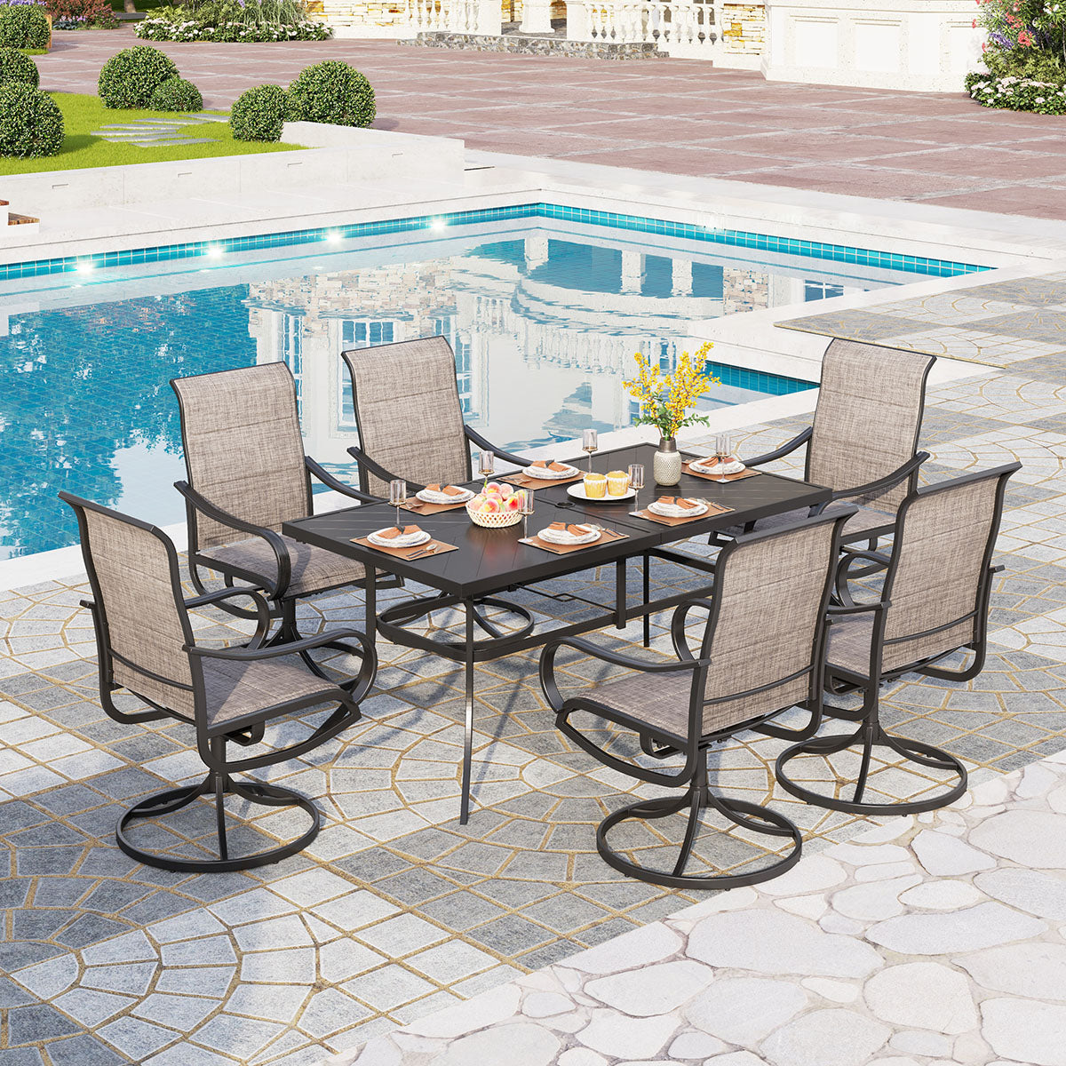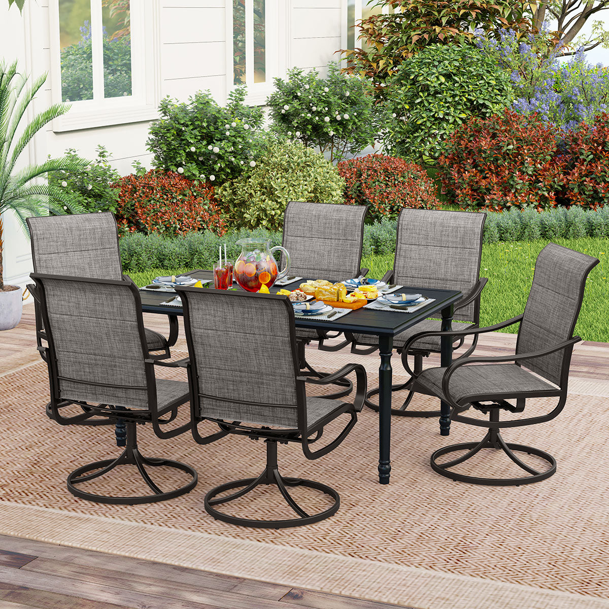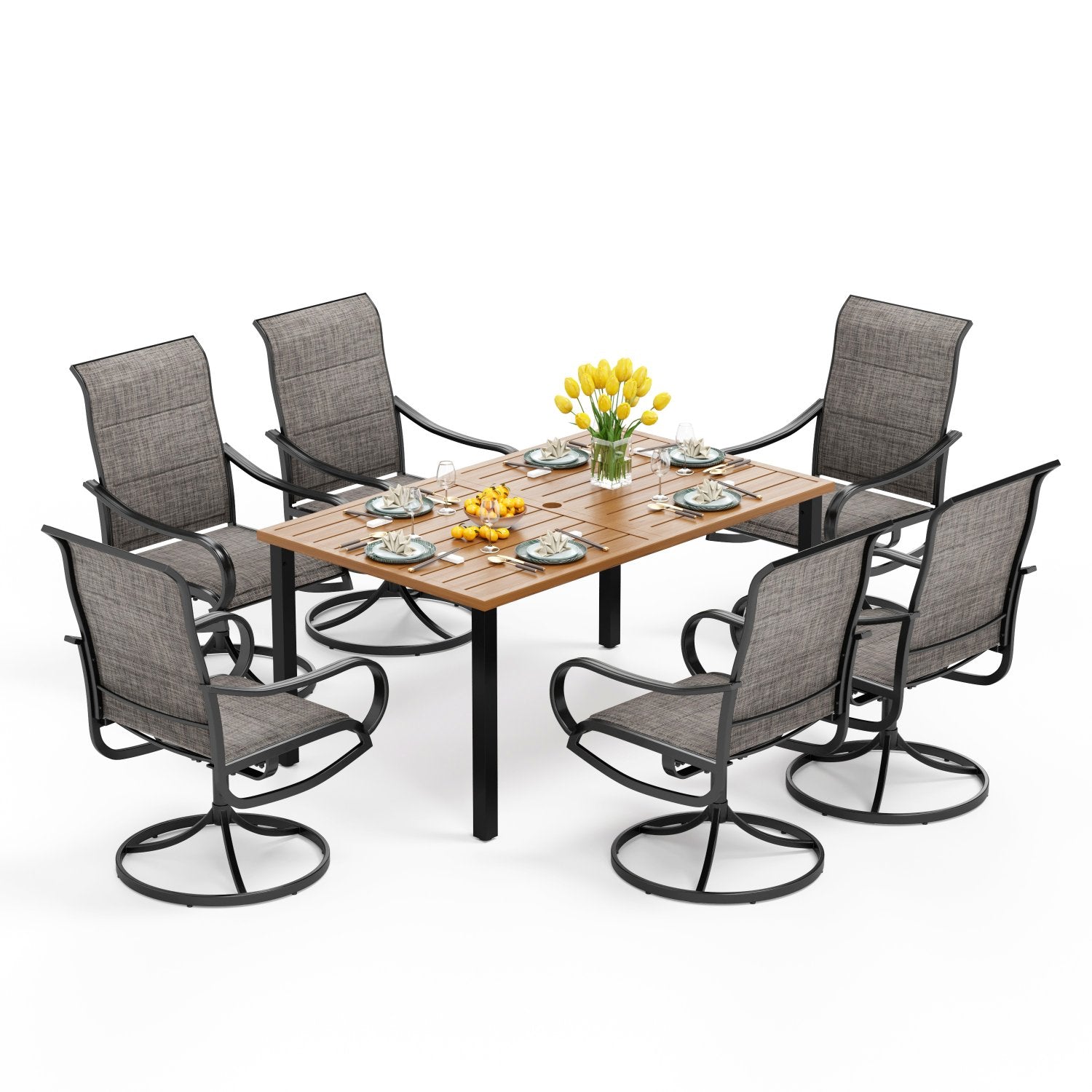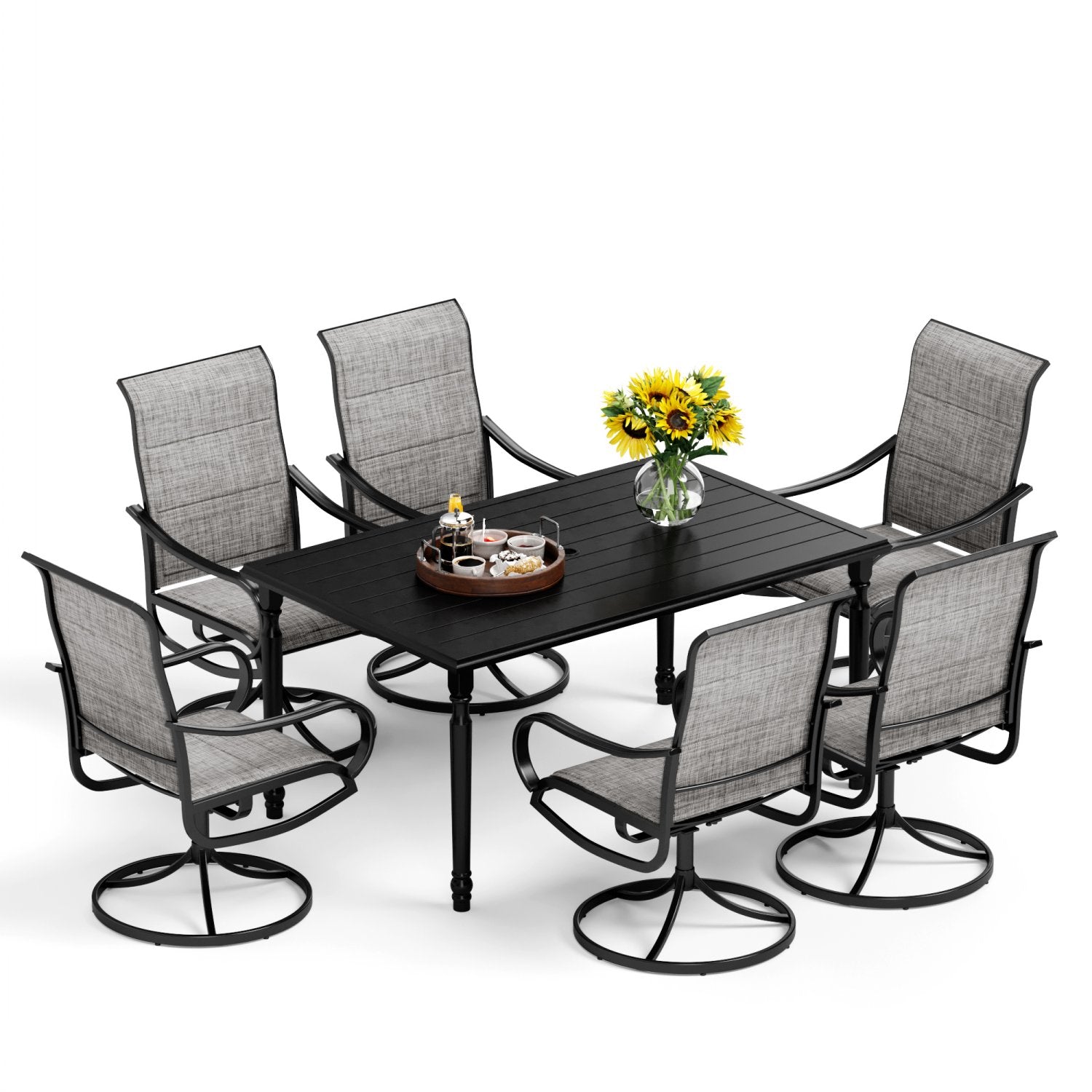 7-Piece Patio Dining Set 6 Textilene Padded Swivel Chairs and Steel Rectangle Table