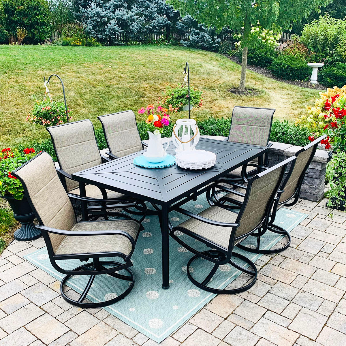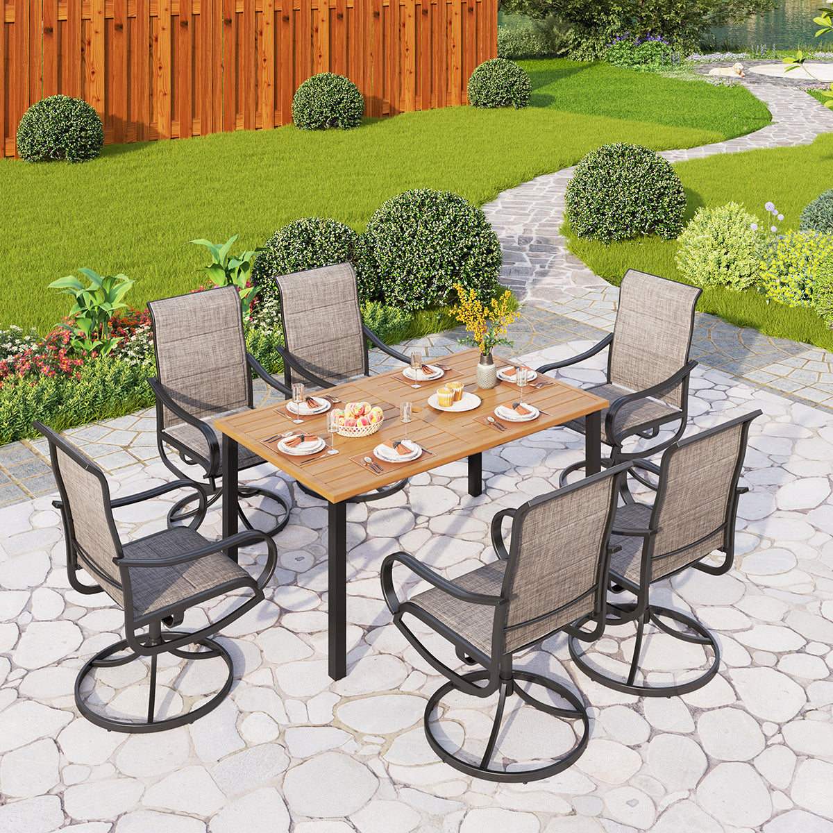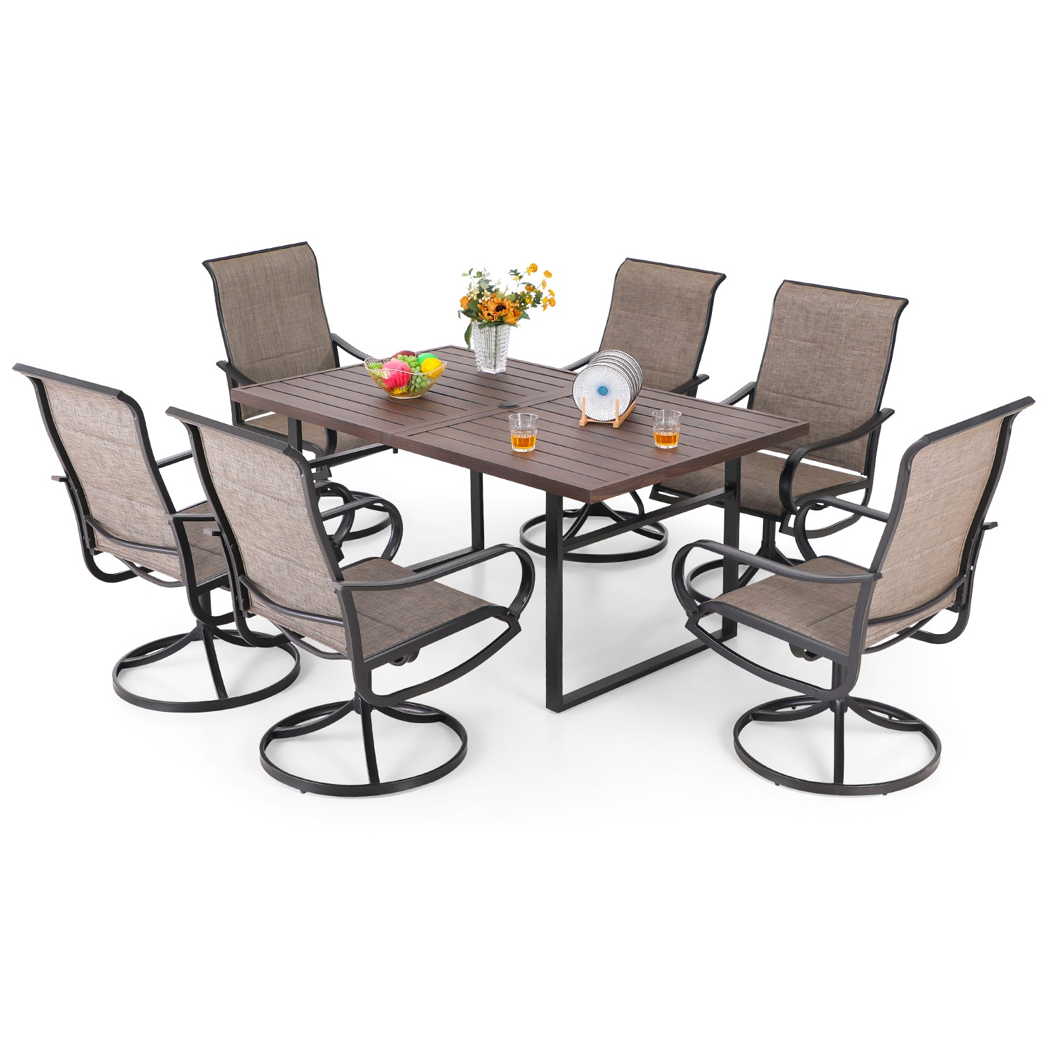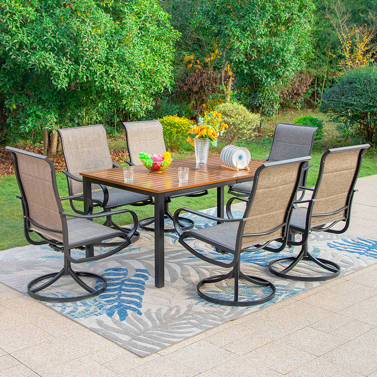 7-Piece Patio Dining Set 6 Textilene Padded Swivel Chairs and Steel Rectangle Table