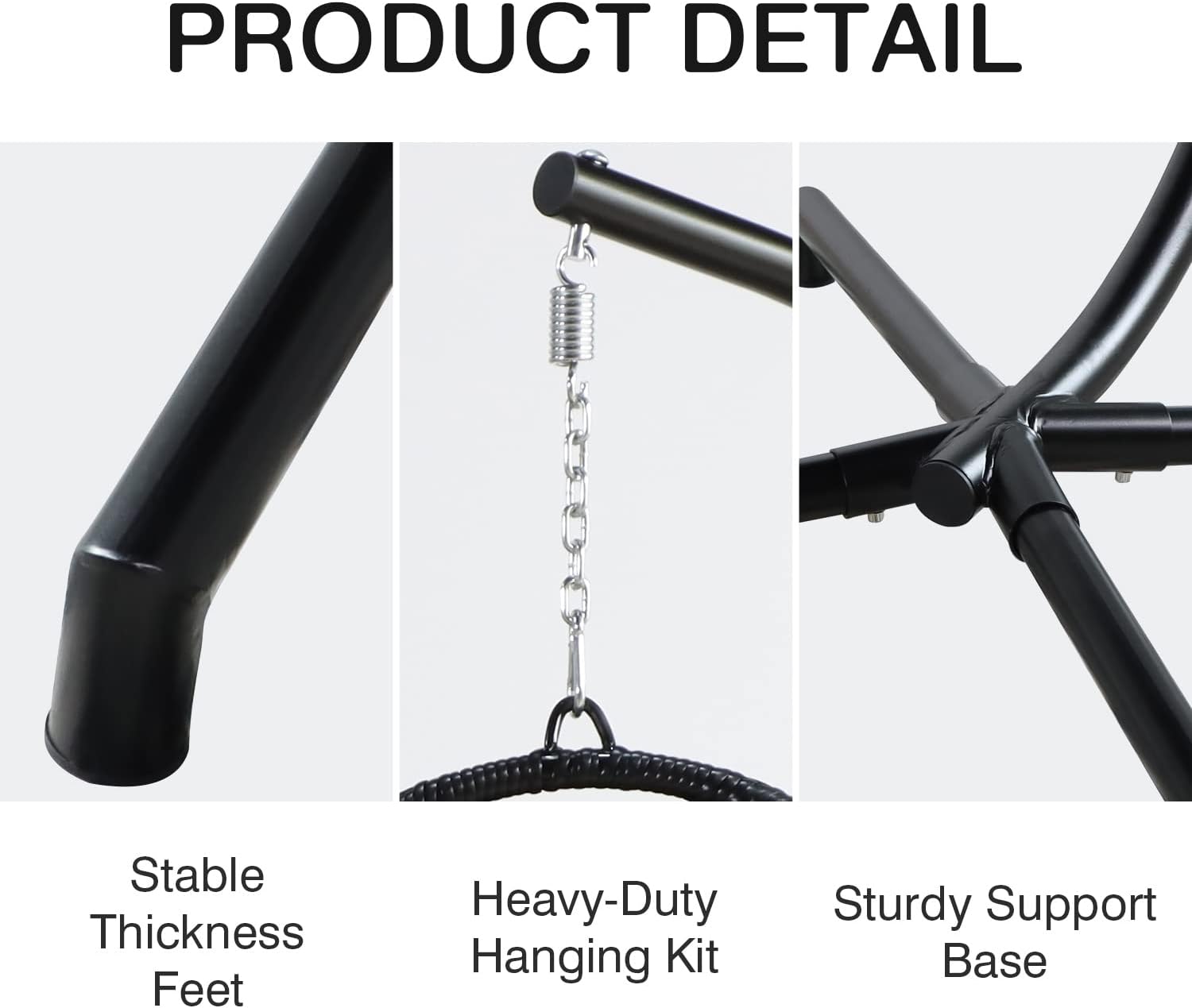 - [Sturdy & Durable Hanging Chair] Egg swing chair is wrapped in high quality rattan wicker on a sturdy steel frame, the strong metal tube C stand with anti-rust powder coating on the surface can bear 330 pounds. The 4 metal feet evenly distribute the weight so that it won't roll over and ensure your safety.