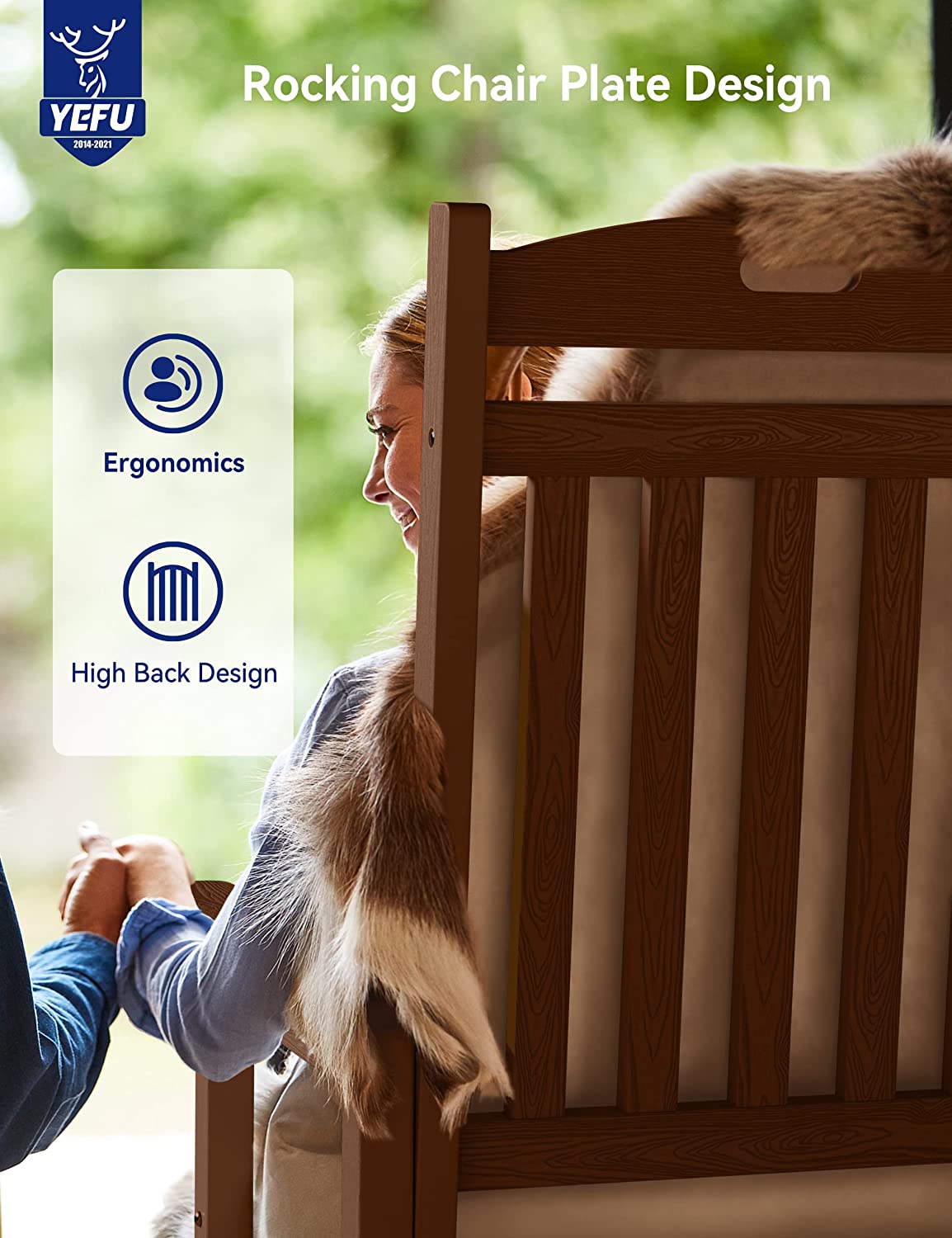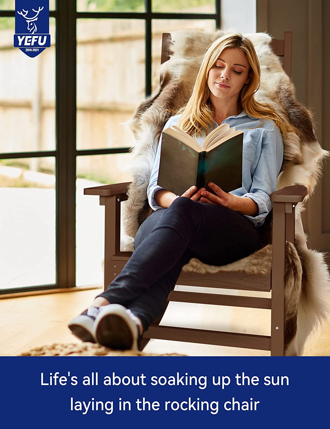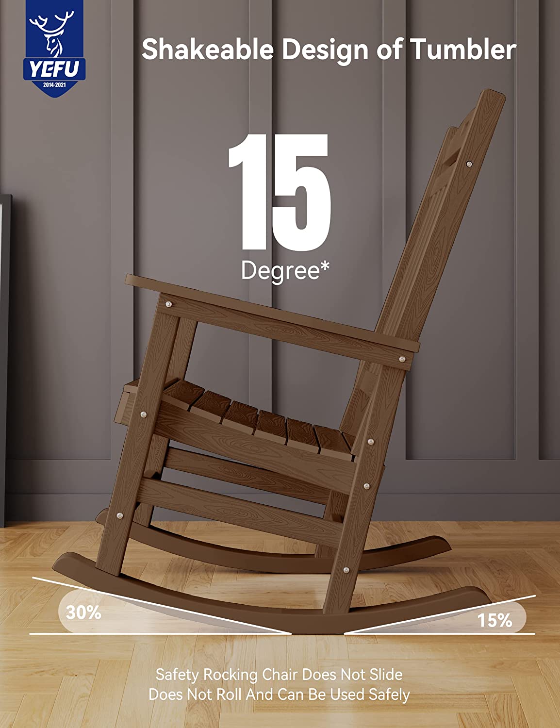 - Material: YEFU rocking chair is made of high impact polystyrene, which makes the surface material look more natural with a wooden feel. It is waterproof, anti-corrosion and anti-fading material, unlike wood which is easily rotten. Besides, the 304 stainless steel screws connected make the chair more durable.