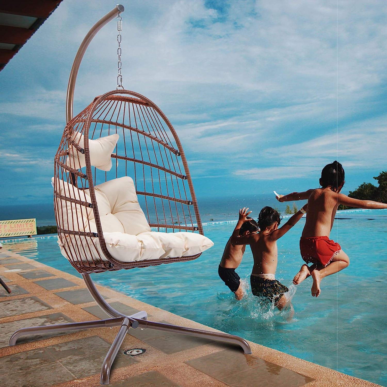 RADIATA Foldable Wicker Rattan Hanging Egg Chair with Stand, Swing Chair with Cushion and Pillow, Lounging Chair for Indoor Outdoor Bedroom Patio Garden (Beige with Stand)