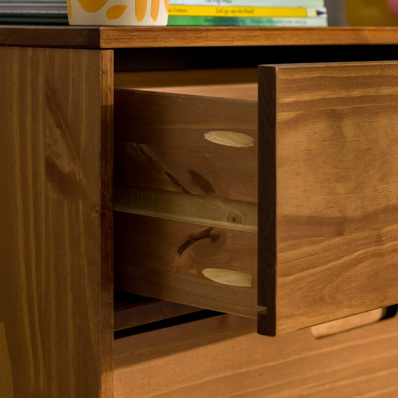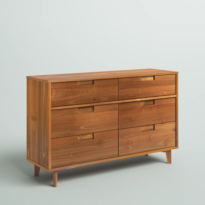 This 6-drawer double dresser adds mid-century modern style to your bedroom or guest room. It's built from solid pine and engineered wood with a neutral finish that showcases its natural wood grain, knots, and all. This dresser features a streamlined rectangular shape, and it stands on splayed tapered legs. The six wood-slide drawers offer plenty of space to tuck away your wardrobe – including everything from tees to denim. Minimalist wood cutouts double as drawer pulls, completing the understated aesthetic and warm palette.