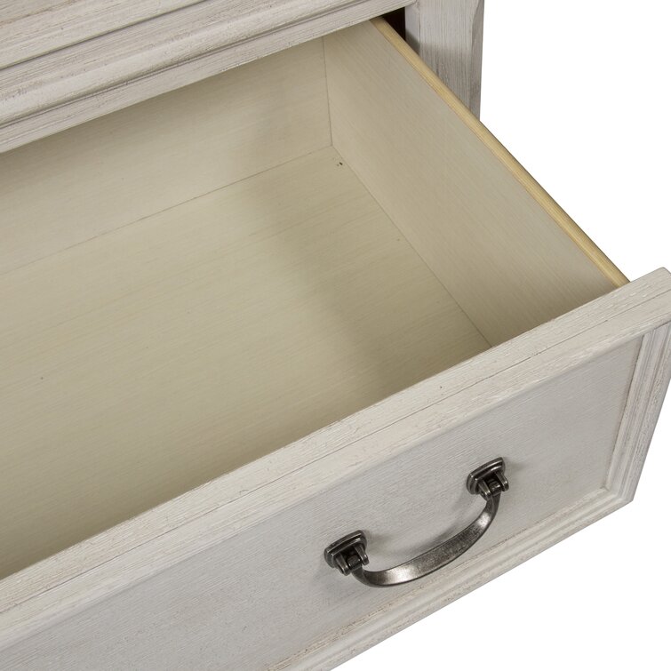 Enhance your room with this timeless 7-drawer dresser, creating a shabby chic interior that all homeowners love. Crafted with pine solids and acacia veneers, this dresser is unique with its antique white finish accented by heavy wire brushing. Enjoy the abundance of storage with the 3 small drawers and 4 larger drawers, each equipped with bottom case dust proofing.