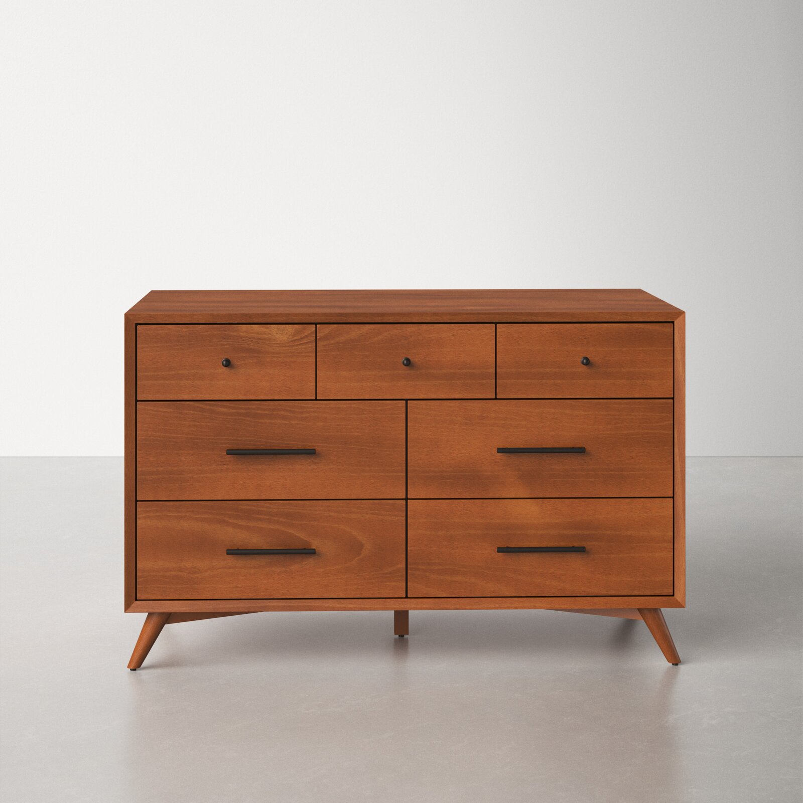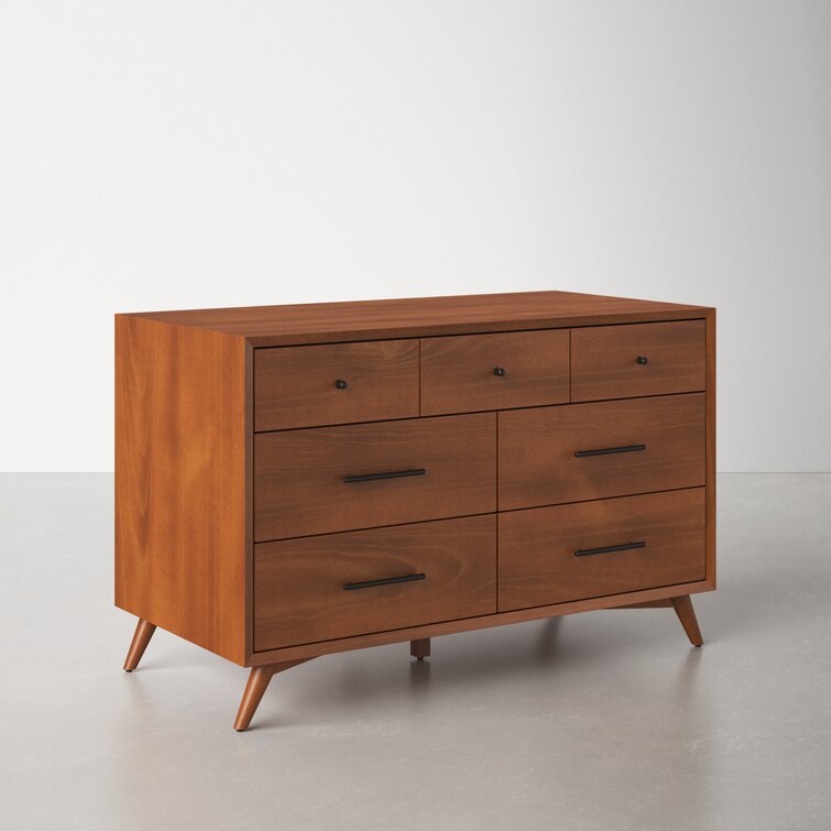 When it comes to your bedroom, it seems like storage space is always at a premium. Don’t worry, this dresser is here to help. Crafted from solid wood, this piece features seven drawers on metal ball-bearing glides, so it’s ideal for tucking away the rest of your displaced wardrobe. Perched atop slightly splayed legs for a mid-century modern touch, this piece sports beveled edges on its clean-lined design, working well in a variety of aesthetics.