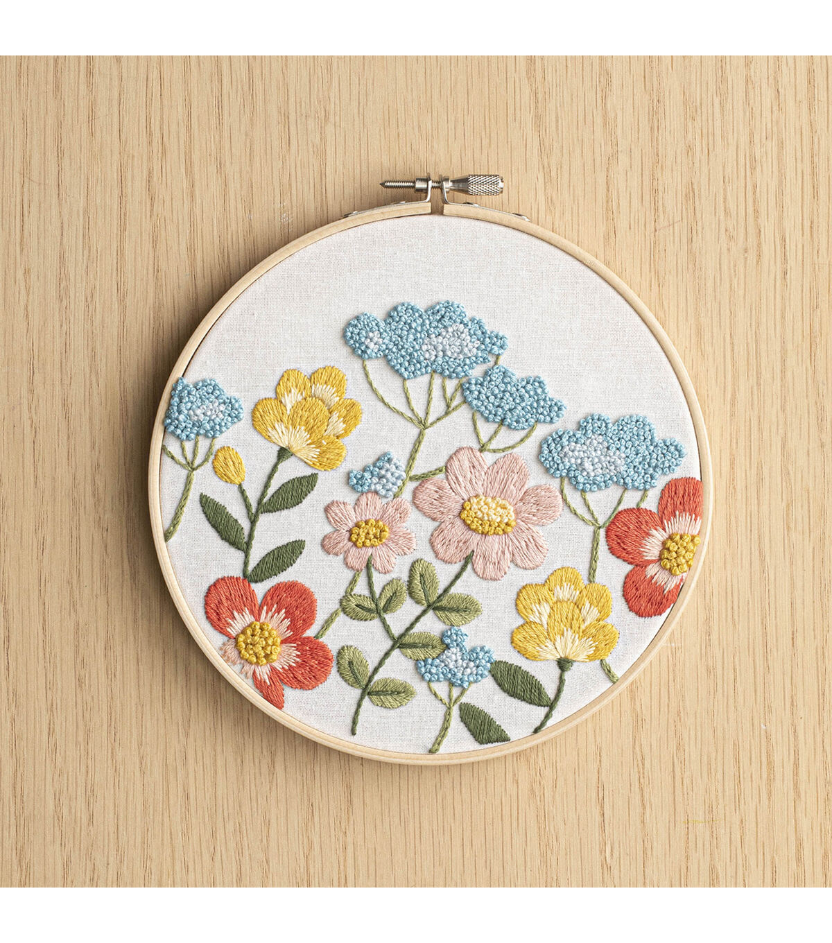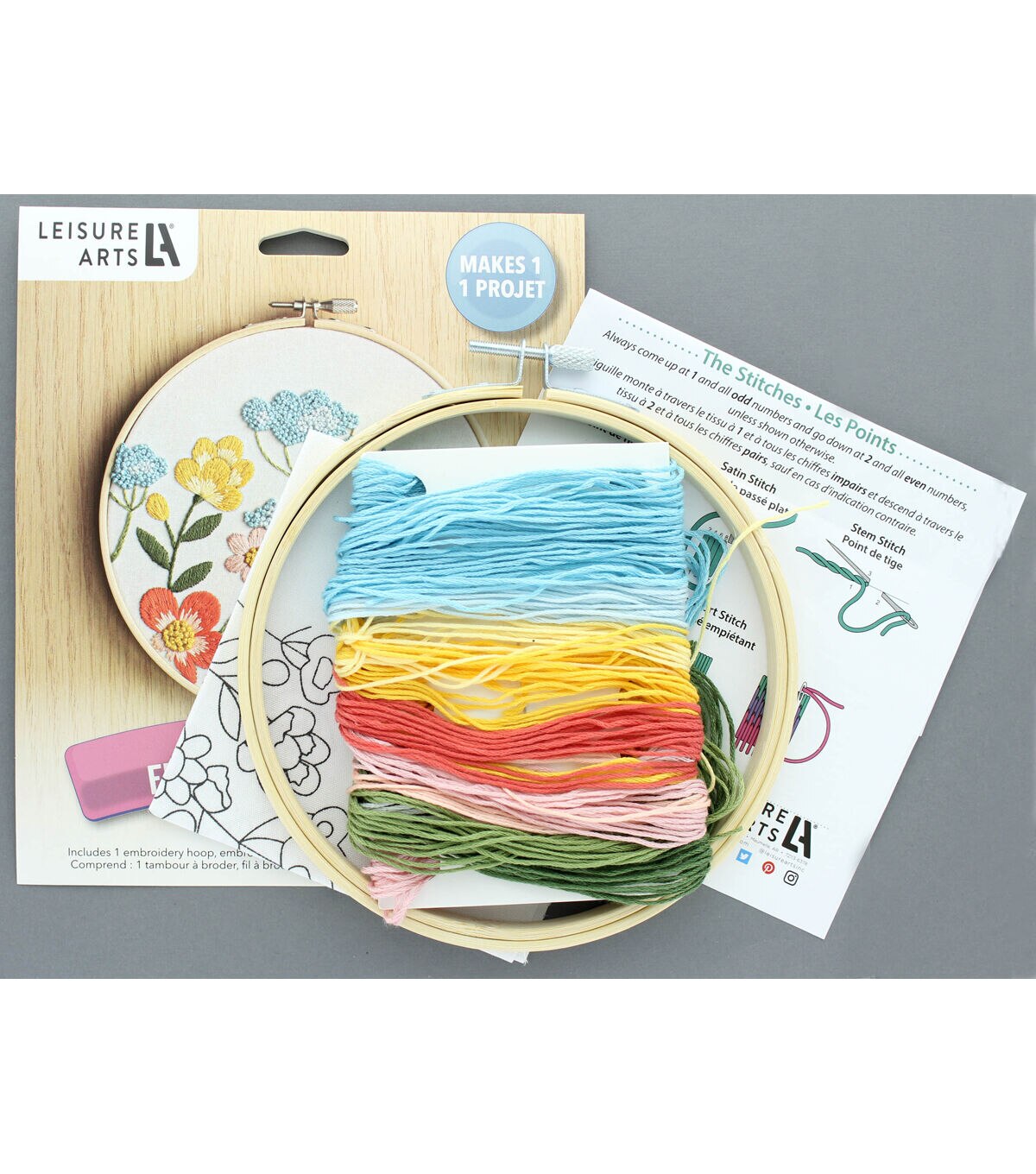 Leisure Arts Kit Embroidery 6" Garden Fresh- Embroidery kit contains: 6" embroidery hoop, 8 floss colors, pre-printed fabric, a needle, and instructions. Design is pink, yellow, blue, and coral flowers with green stems and leaves.