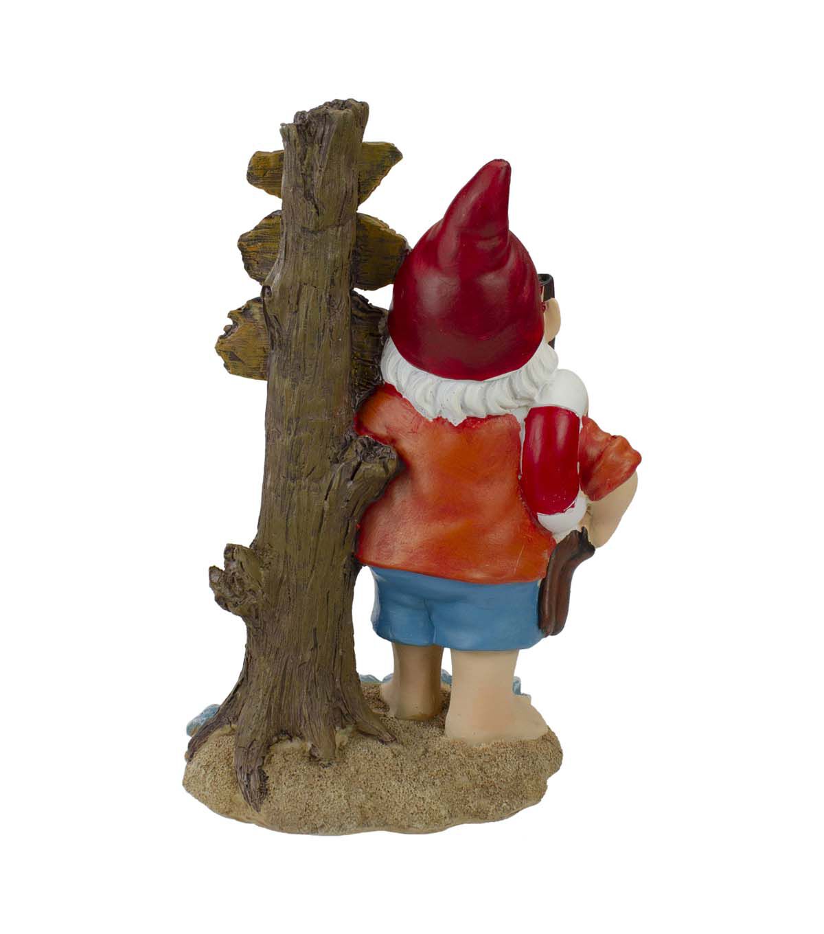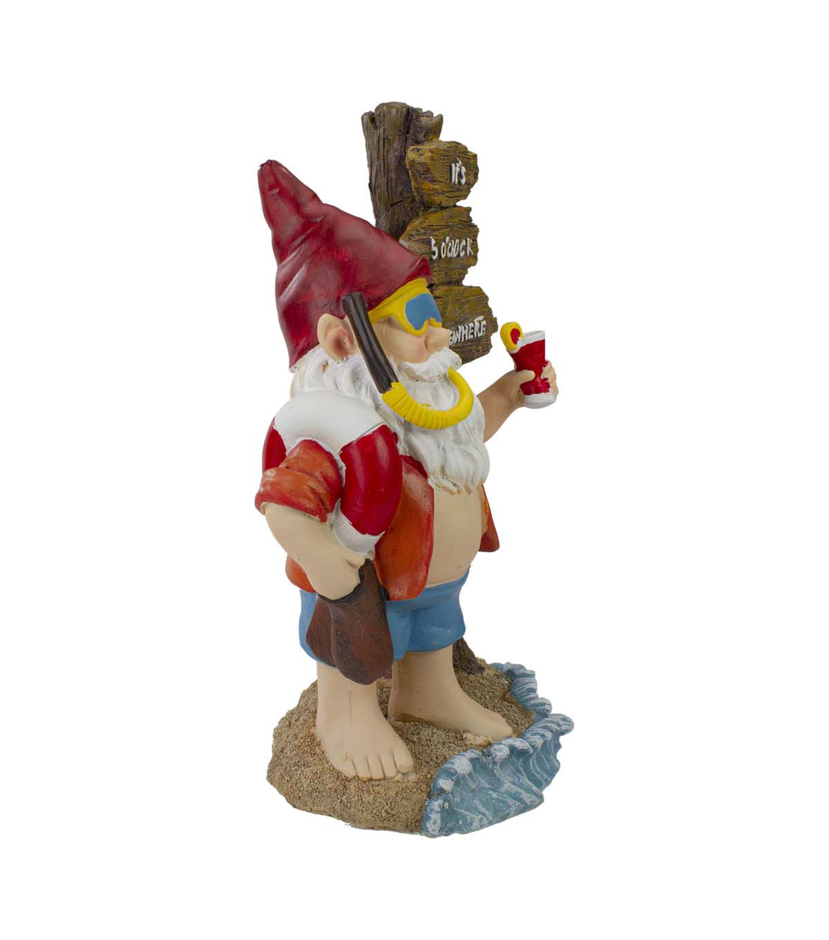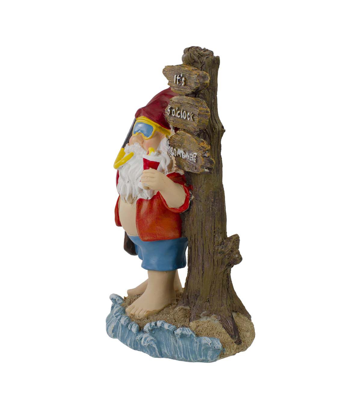 This gnome is ready for the beach. He has his goggles snorkel flippers flotation ring and last but not least his ice-cold tropical drink. As the sign says "It's 5 o'clock somewhere". This fun garden statue will make a great addition to your backyard front yard garden porch or to add a little fun to your indoor space.