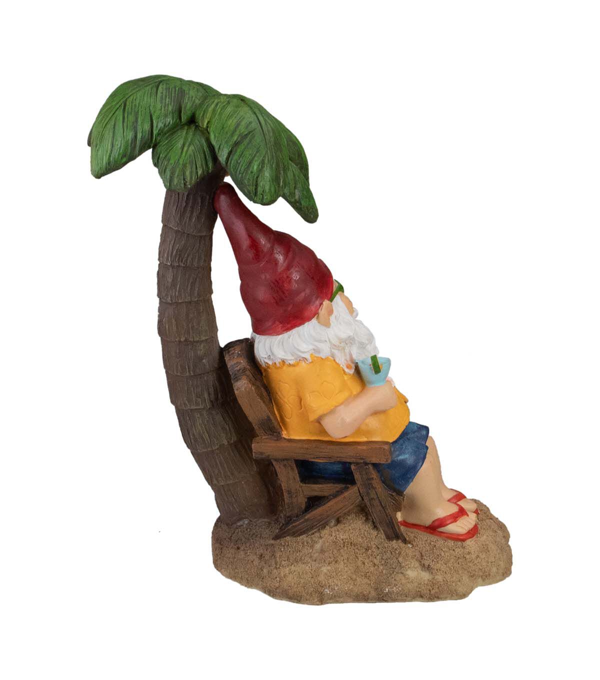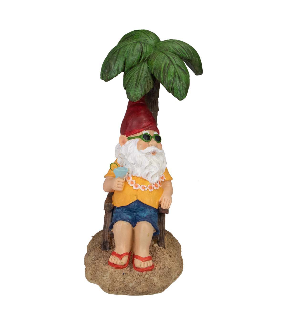 This gnome is ready for the beach. He's wearing his cool sunglasses and his flip-flops and enjoying an ice-cold tropical drink while relaxing under a palm tree. This fun statue will make a great addition to your backyard front yard garden porch deck or to add a little fun to your indoor space.
