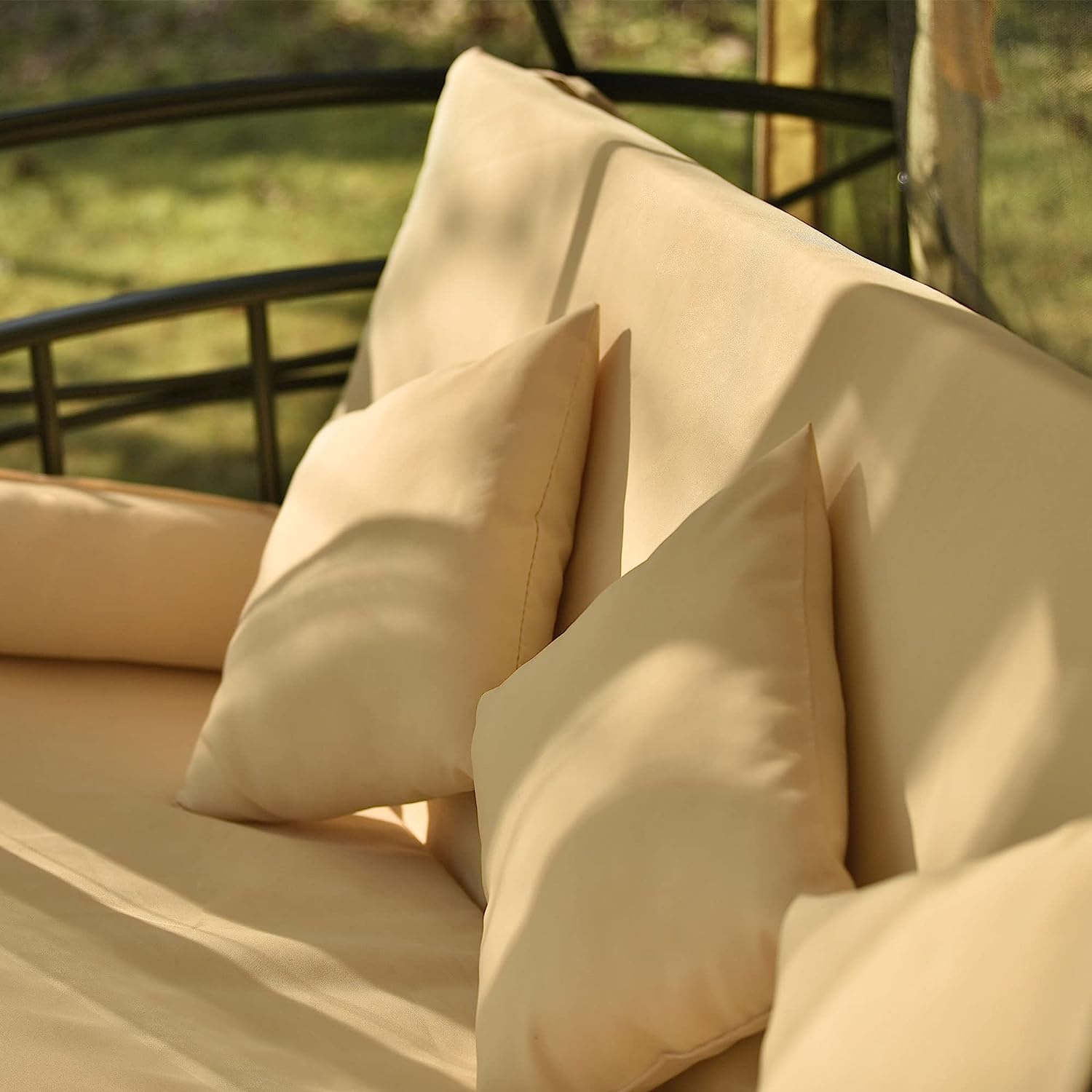 - 🌞【STURDY AND STABLE STEEL CONSTRUCTION】 The Garden Swing Bed with a strong reinforced metal frame provids a strong support and security, ensuring stability and firmness. In addition, 8 ground stakes are provided to fix the gazebo better in various weather conditions. It is sturdy and safe enough to withstand harsh outdoor conditions, ensuring you can use it outdoors all year round without worrying about damage caused by exposure to the elements.