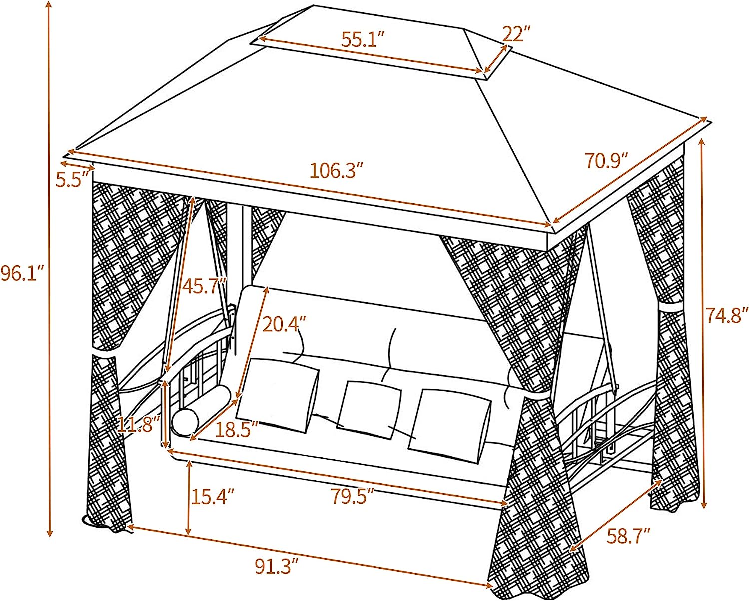- 🌞【2-TIER VENTED DURABLE CANOPY】 The canopy of Gazebo Patio Swing made of waterproof and breathable PU coated polyester, is durable and weather-resistant enough for a long-term use. The double-layer canopy design provides sufficient airflow to ensure good air circulation to keep cool in hot weather. Besides, the waterproof fabric with drainage hole design can prevent water accumulation in rainy days.