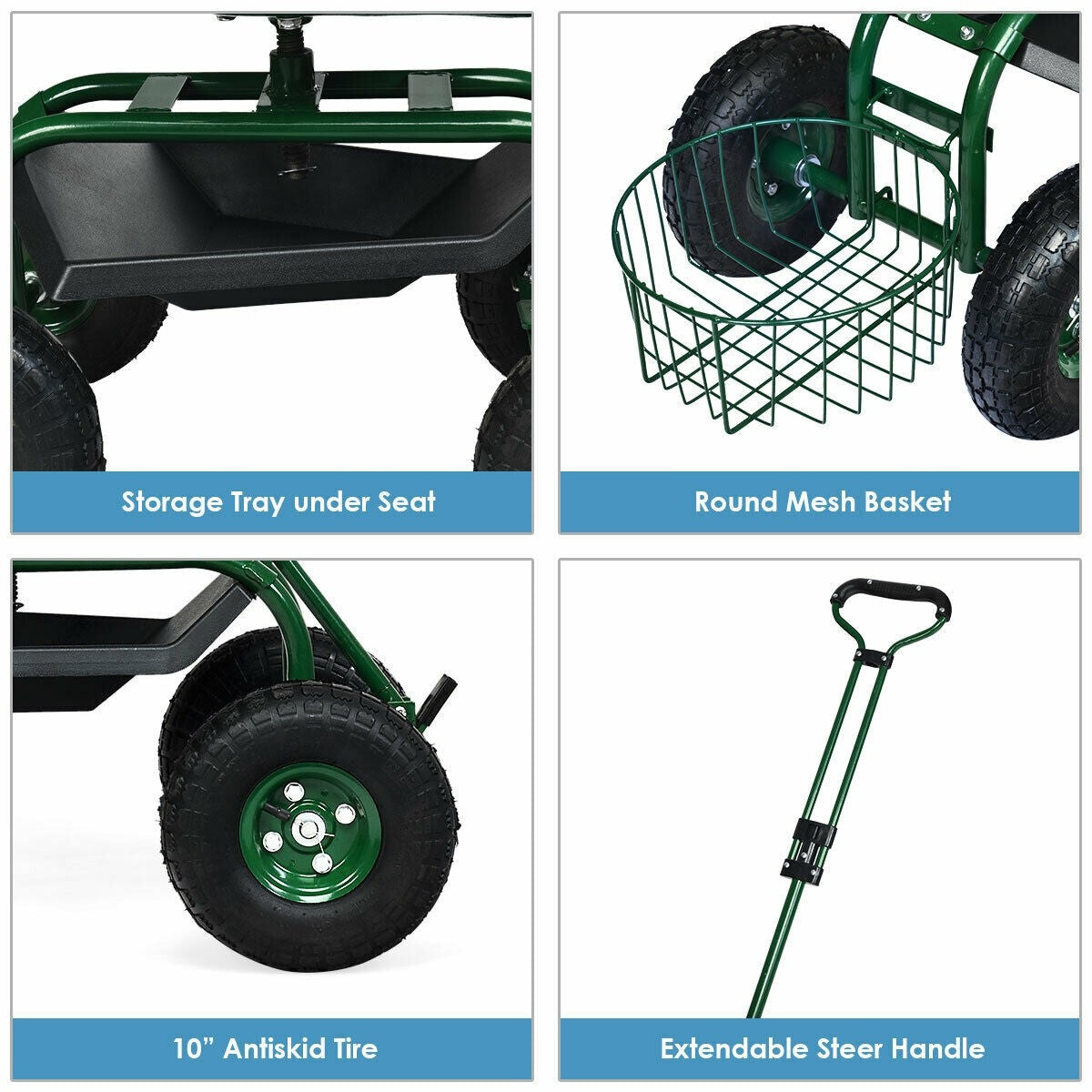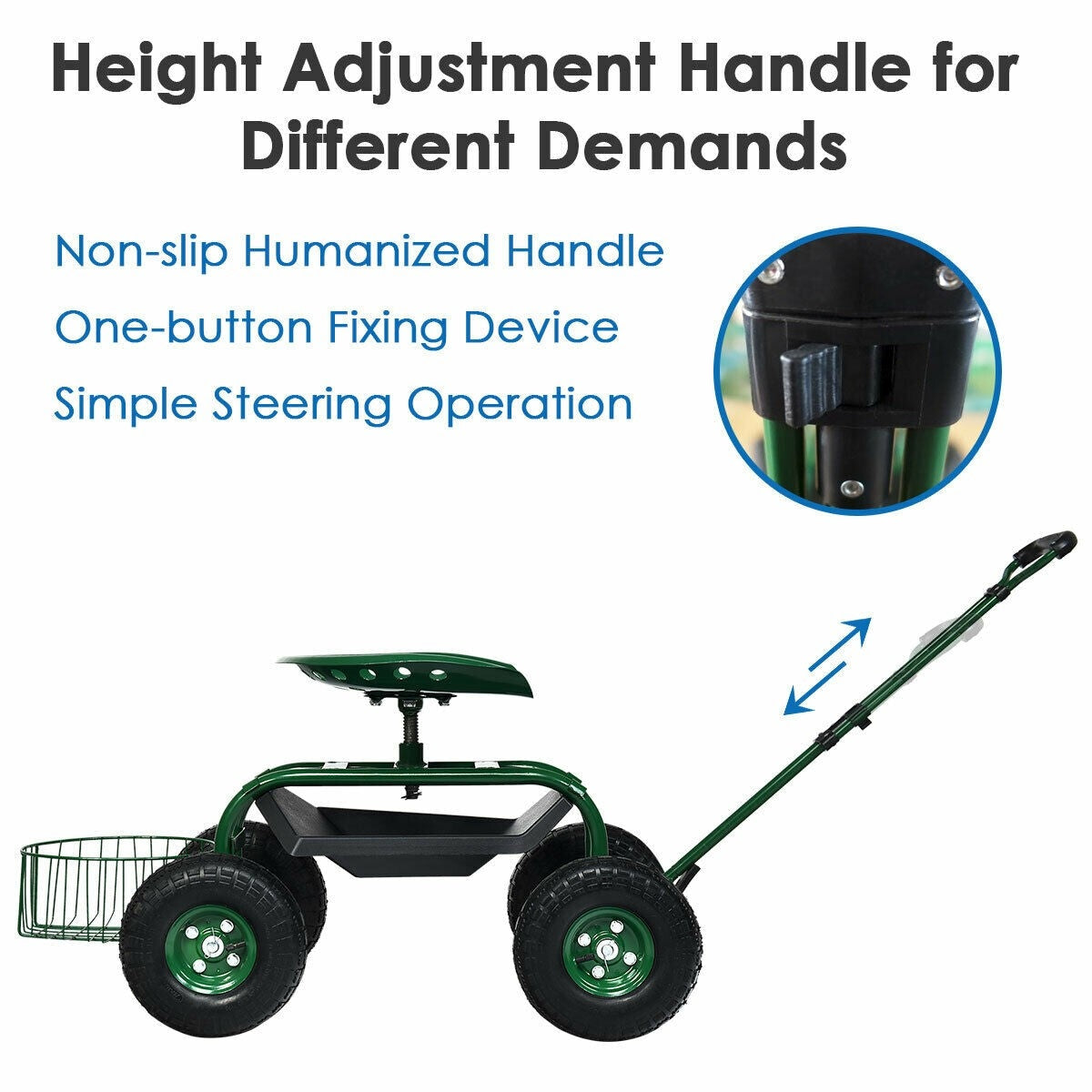 Heavy Duty Rolling Garden Cart with 360 Swivel Seat & Extendable Steer Handle