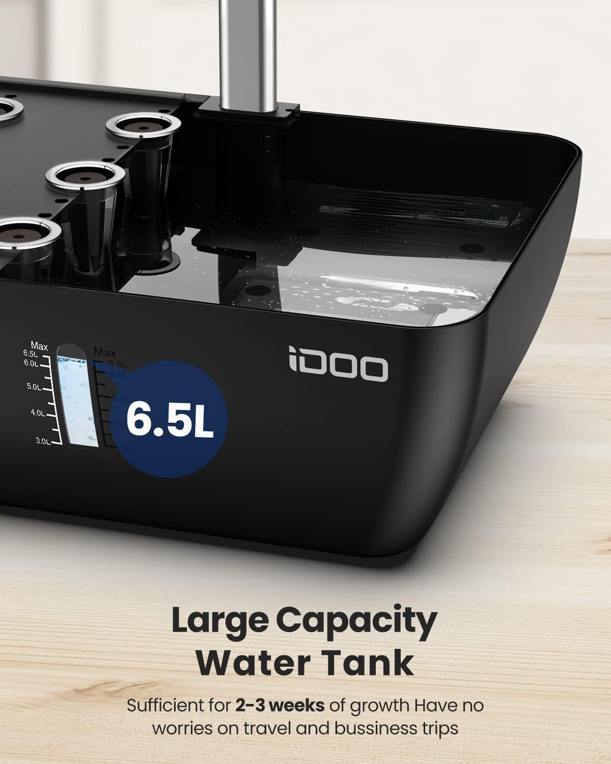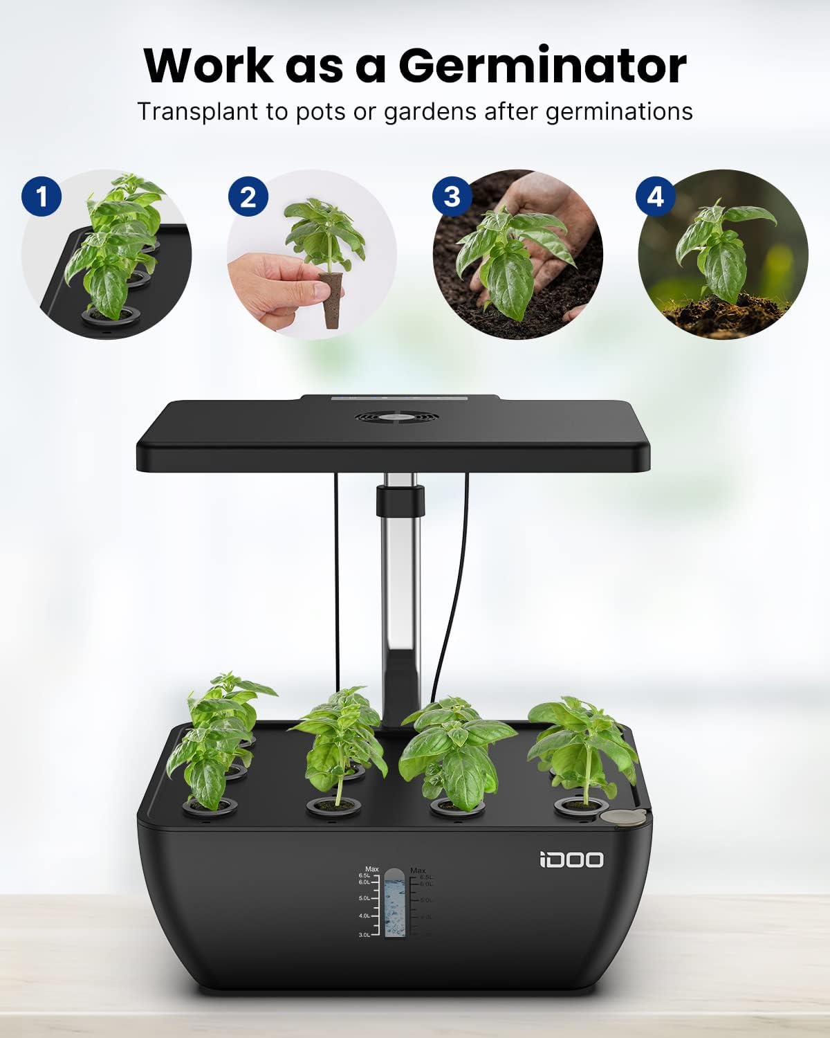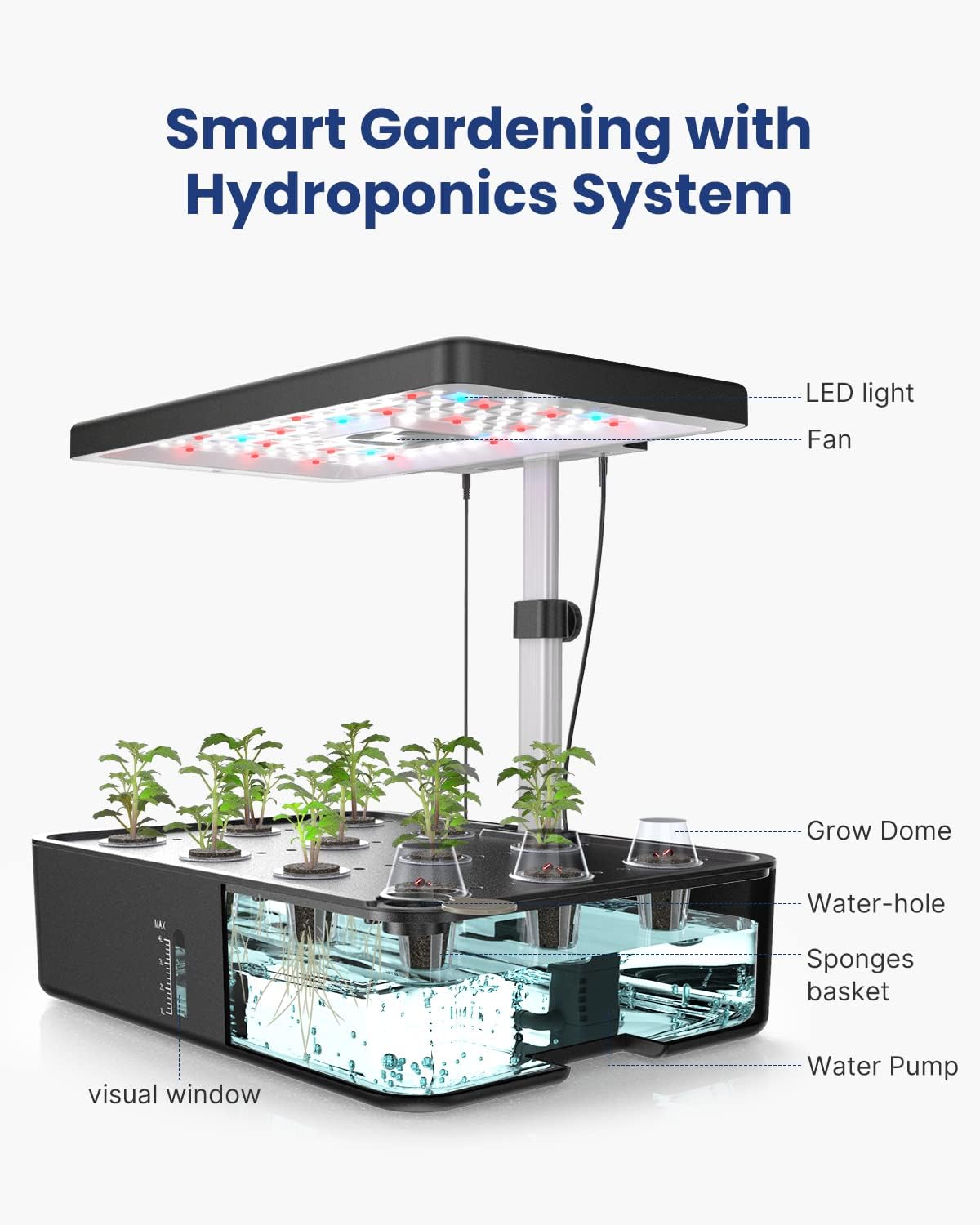 - 4.5L Water Tank and Fan: Hydroponics growing system built-in a fan which spreads pollen in florescence, disperses heat in germination. Indepandent 4.5L water tank can support plants to grow for 1-2 weeks in the growth period. A visual window can see how much water in tank.