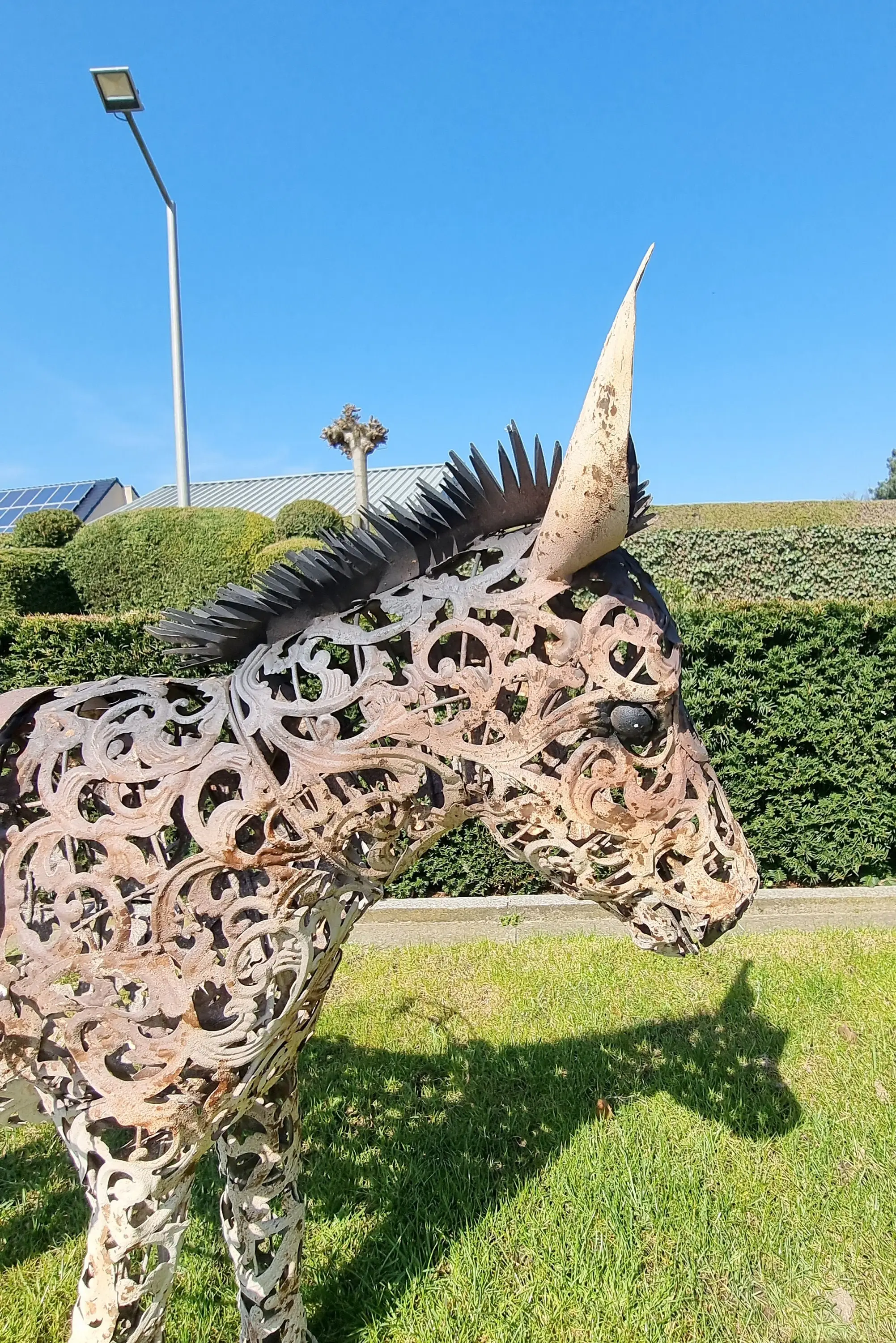 Very nice large iron easel. Decorative easel for the garden. Donkey with two flower baskets. The baskets around the donkey can be filled with flowers. Very decorative and beautiful. Lawn art, The dimensions of this iron easel are as follows (+/-):