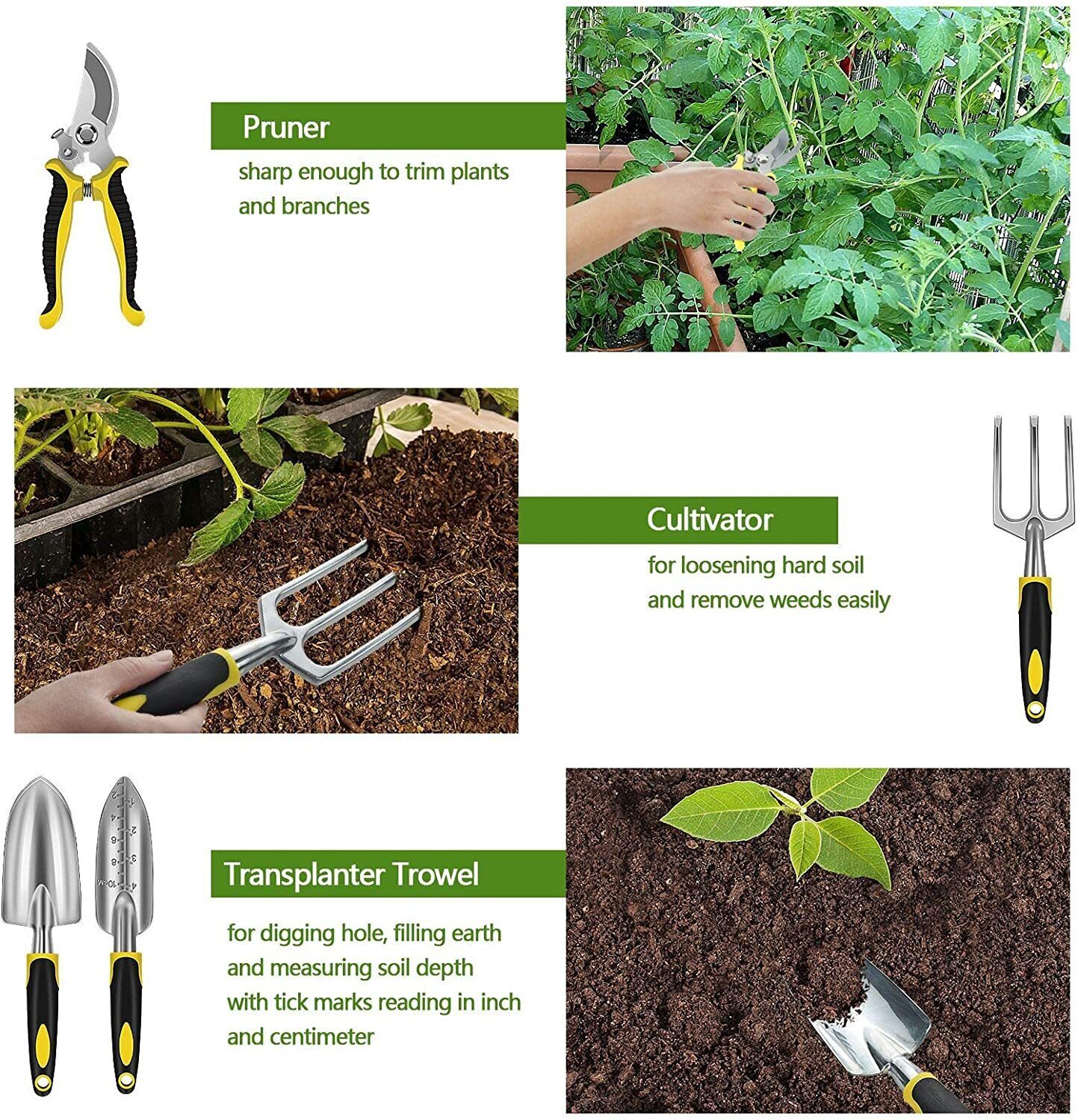 • Abundant accessories: we provide 2 large capacity storage bags to help you store all kinds of things you need for gardening without worrying about clutter. There are also 6 excellent quality aluminum gardening tools (including 2Pcs transplanter trowel, hand rake, weeder, pruner, cultivator), and a pair of gardening digging gloves, so you don't need to buy additional auxiliary tools