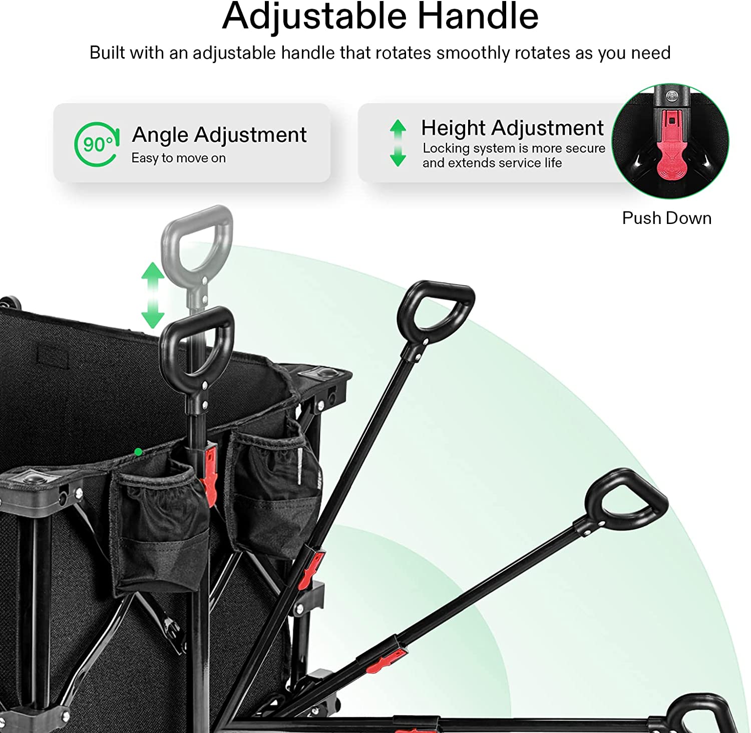 - Adjustable Handle: Built with an adjustable handle that rotates smoothly rotates as you need; The handle locks in place with a joint so it won’t drop, and there’s no need to worry about an out-of-control wagon