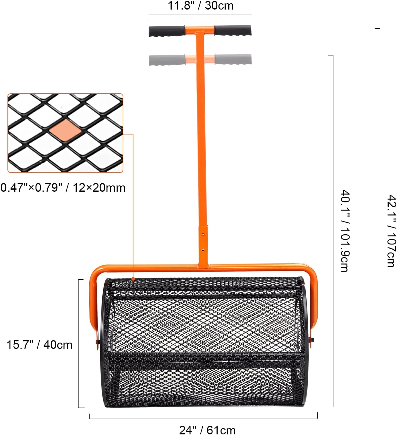 Compost Spreader, 24.4-25.6" Height Adjustable Handle, 24" Wide, Lawn and Garden Peat Moss Roller with Side Latches, Powder Coated Steel Mesh Basket for Spreading Manure, Topsoil