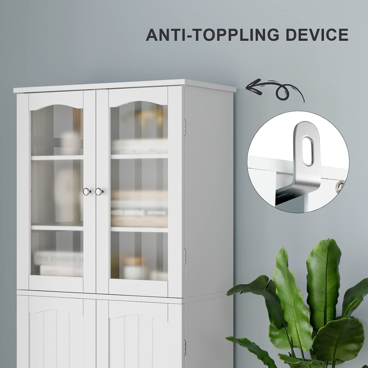 The tall pantry storage cabinet provides all the storage space you need to make your kitchen perfectly organized. It features a top cabinet with frosted glass doors and 3 interior shelves for tableware, canned food, etc. The bottom cabinets can be used to store odds and ends. This pantry cabinet has an excellent design that is just the right choice for your home or office break room.