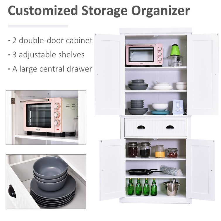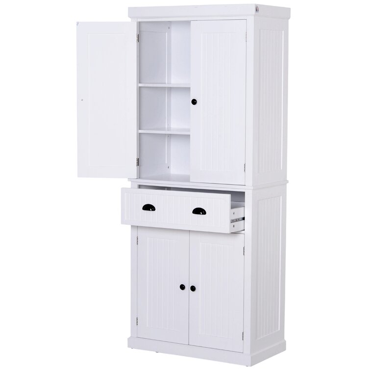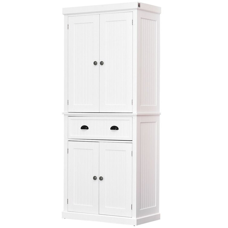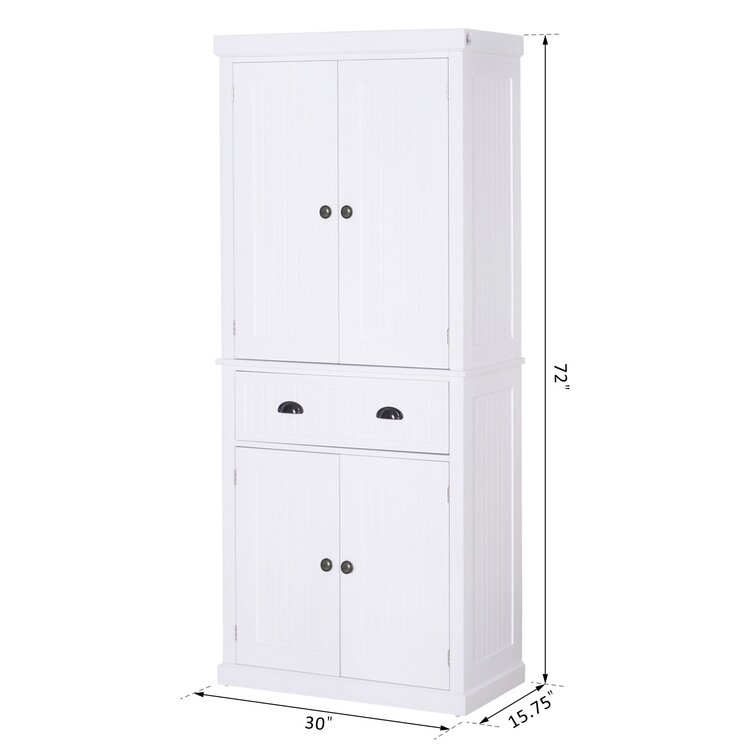 Create a functional and stylish statement in any room where a little extra storage is needed with this tall colonial-inspired cabinet. With a central drawer for knickknacks, or towels, and four adjustable shelves perfect for dishes, packaged foods, or cookbooks, this cabinet is perfect for storage without the clutter. Crafted in a neutral hue with a reinforced backboard, it also includes wall mounts for enhanced stability.