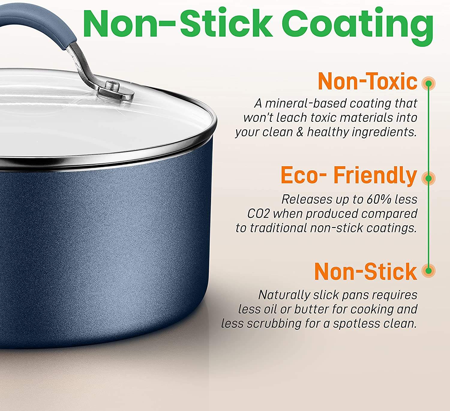 • NON-STICK COATING: The PTFE/PFOA/PFOS-free non stick pot set cooking ware features a long lasting nonstick coating for easy food release or tossing. cleaning & healthy cooking w/ heat resistant lacquer exterior making it resistant to high heat