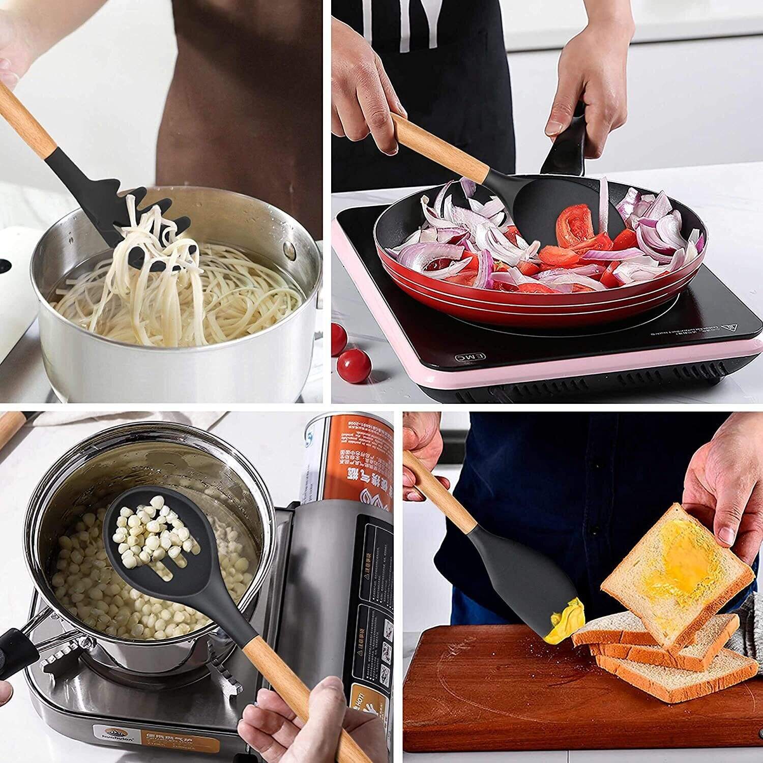 - Heat Resistant. Silicone cookware utensils set can withstand high temperature up to 446?oF. they would not melt at high temperature cooking like frying or touching hot pans. Ergonomic wooden handle can effectively block the heat transfer to prevent the chefa??s hands from scalding during cooking