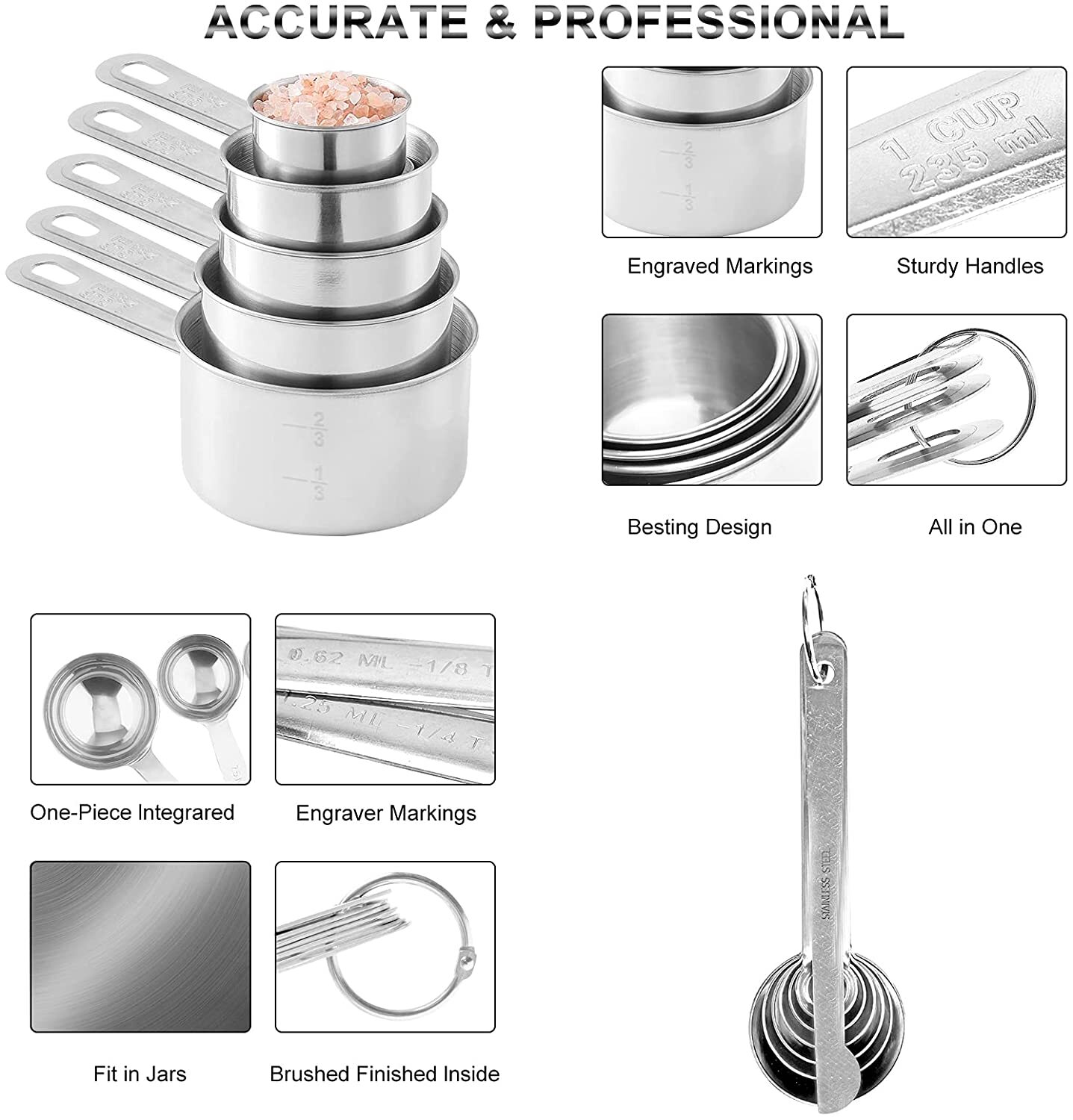 • 4 PCS Measuring Cups: sizes 1 cup, 1/2 cup, 1/3 cup, and 1/4 cup. Easy to read engraved sizes showing 'mls' for dry & liquid measurement. Measuring cups and spoons are made of food grade 304 stainless steel. They are rust resistant, ensuring your cooking remains safe and healthy, with a long service life.