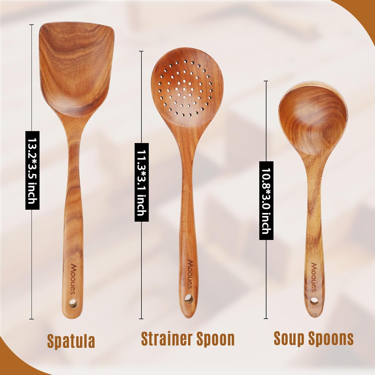 - 👩🍳【Natural Teak Wood】Our wood cooking utensils is made of natural solid teak, which is healthy and safe. Teak is densely grained, hard, and will not crack that it one of the most durable woods, stronger than silicone or bamboo. Wooden spoons are sanded by hand many times, and the surface is smooth will not hurt any cooking tools.