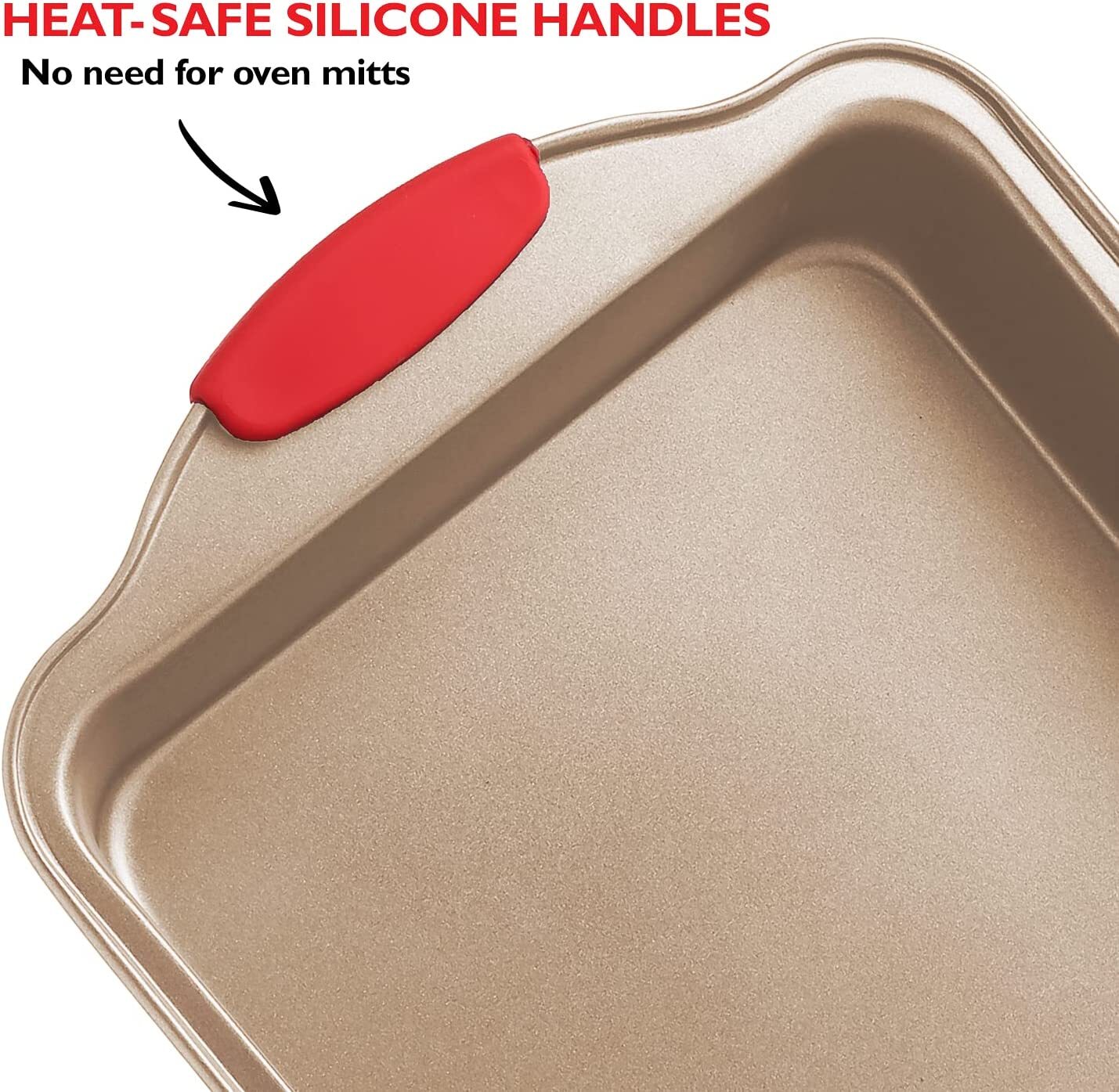 - SAFE N COMFORT SILICONE HANDLES: The commercial-grade restaurant-quality kitchen bakeware features red silicone grips on all bakeware pans to prevent burns and offer you offer plenty of solid, comfortable grasp, even with potholders. We also included an extra set of 5 silicone spatulas to help you out with your delicious baking!